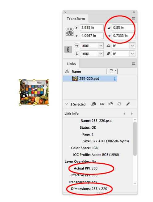 I regret that I still do not understand why the 255x220px image that I made in Photoshop (at 300ppi) isn’t filling the 255x220px frame that I made for it in my InDesign layout when imported at 100%.