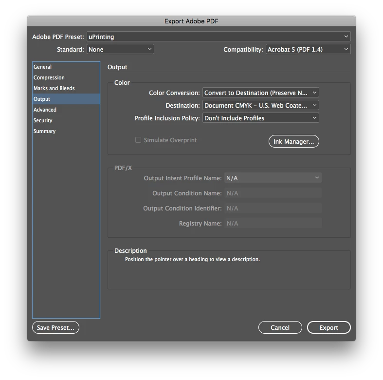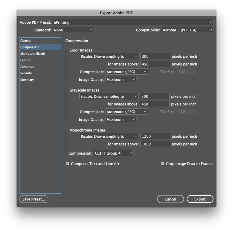 After I removed the green screen, I saved the image as a PSD file and brought it into Lightroom CC, which is my preferred application for color correction and photo retouching. I then saved the photo as a Photoshop PSD and placed it in an InDesign CC document. The final PSD was placed in an image frame that is 1.75 x 2.125 inches. Next, I output the file using a PDF Preset that one of my commercial printers provided, which has worked great in the past. See the attached screenshot below this post for the settings.