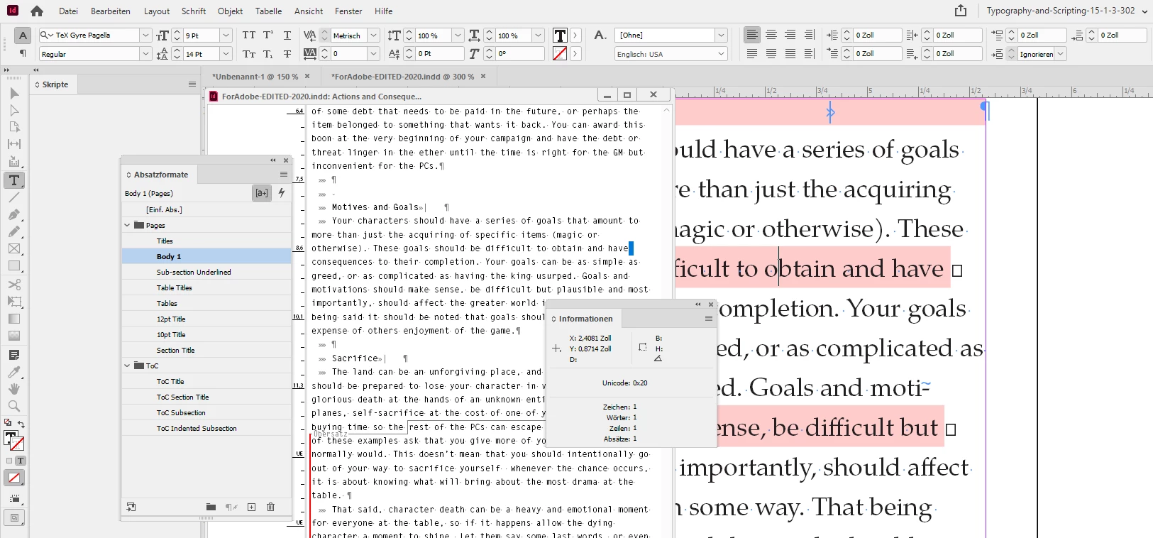 I have Style Override Highlighter enabled. Also invisible characters; where InDesign already has issues to render the little widgets for the blank characters if you look closely. The character at the end of the line is a mystery. Let's use the Story Editor window and the Info panel to detect what it is: