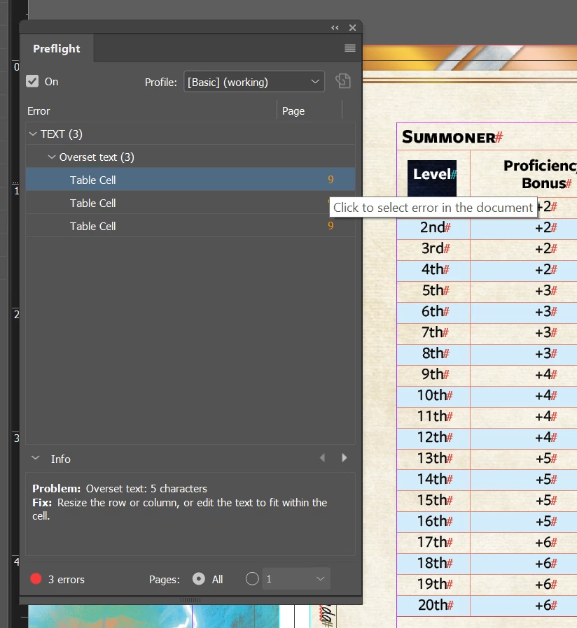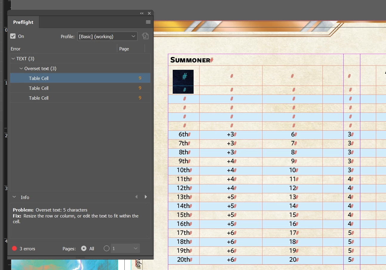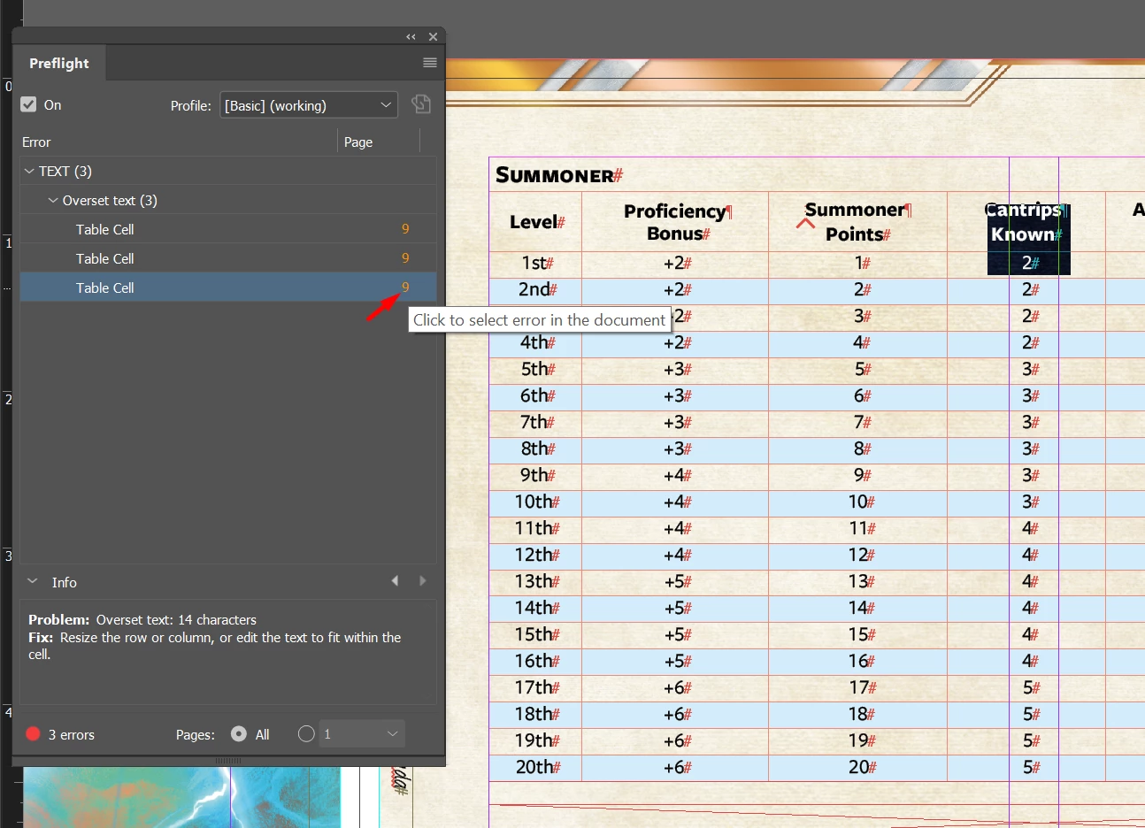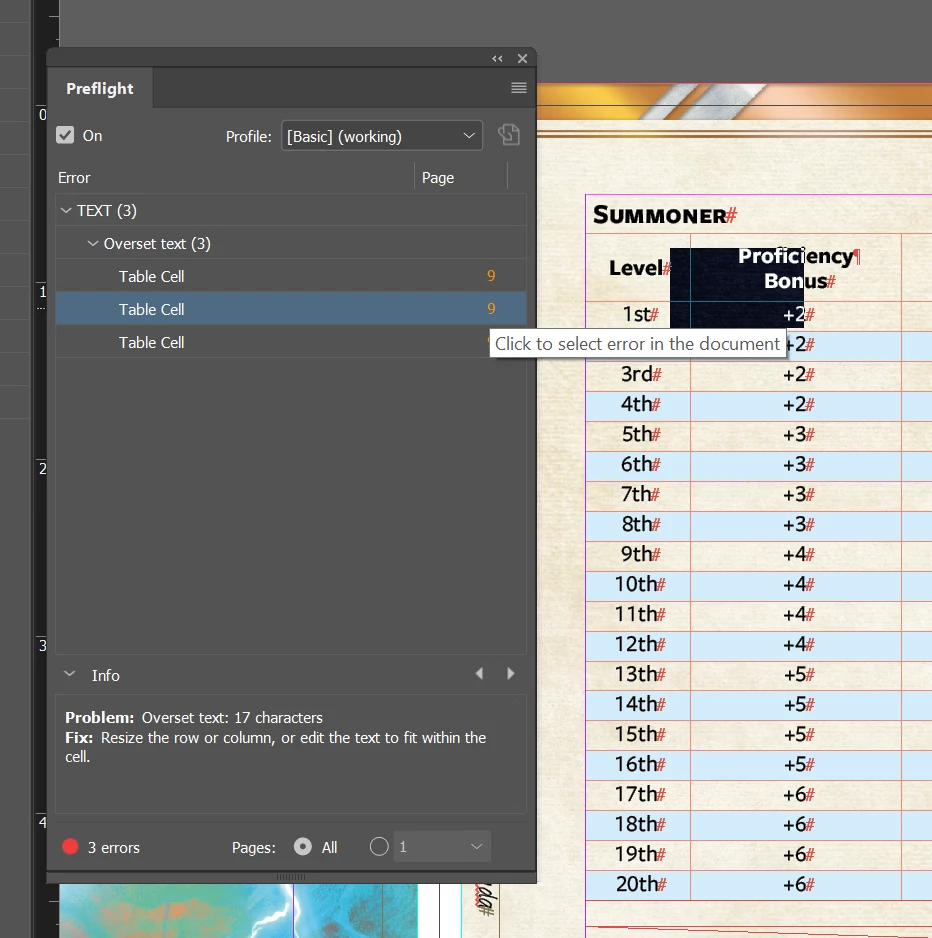 Preflight panel is highlighting overset text in table that doesn't seem to exist