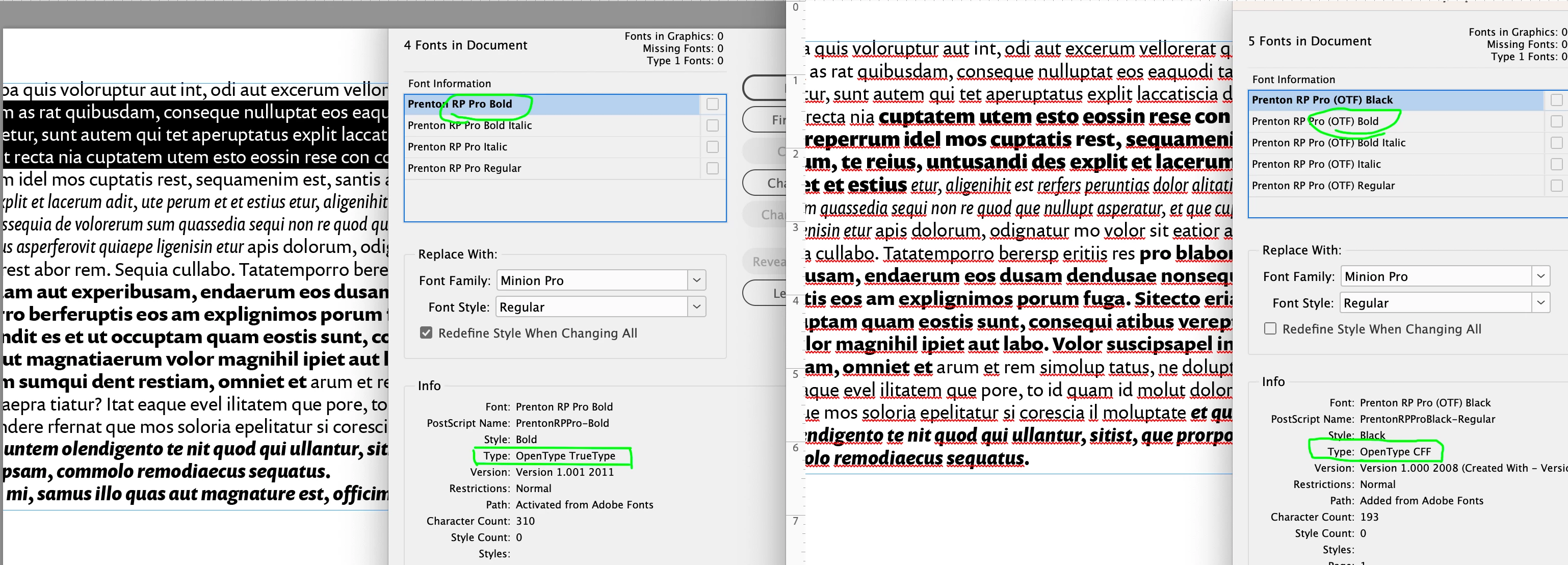 Last week i started getting errors for missing fonts. Indesign has changed the name of the font from “Prenton RP Pro” to “Prenton RP Pro (OTF)” and has split it into two groups: one with Black and Black Italic weights, and one with the other 8 weights in it (Light, Regular, Italic etc).