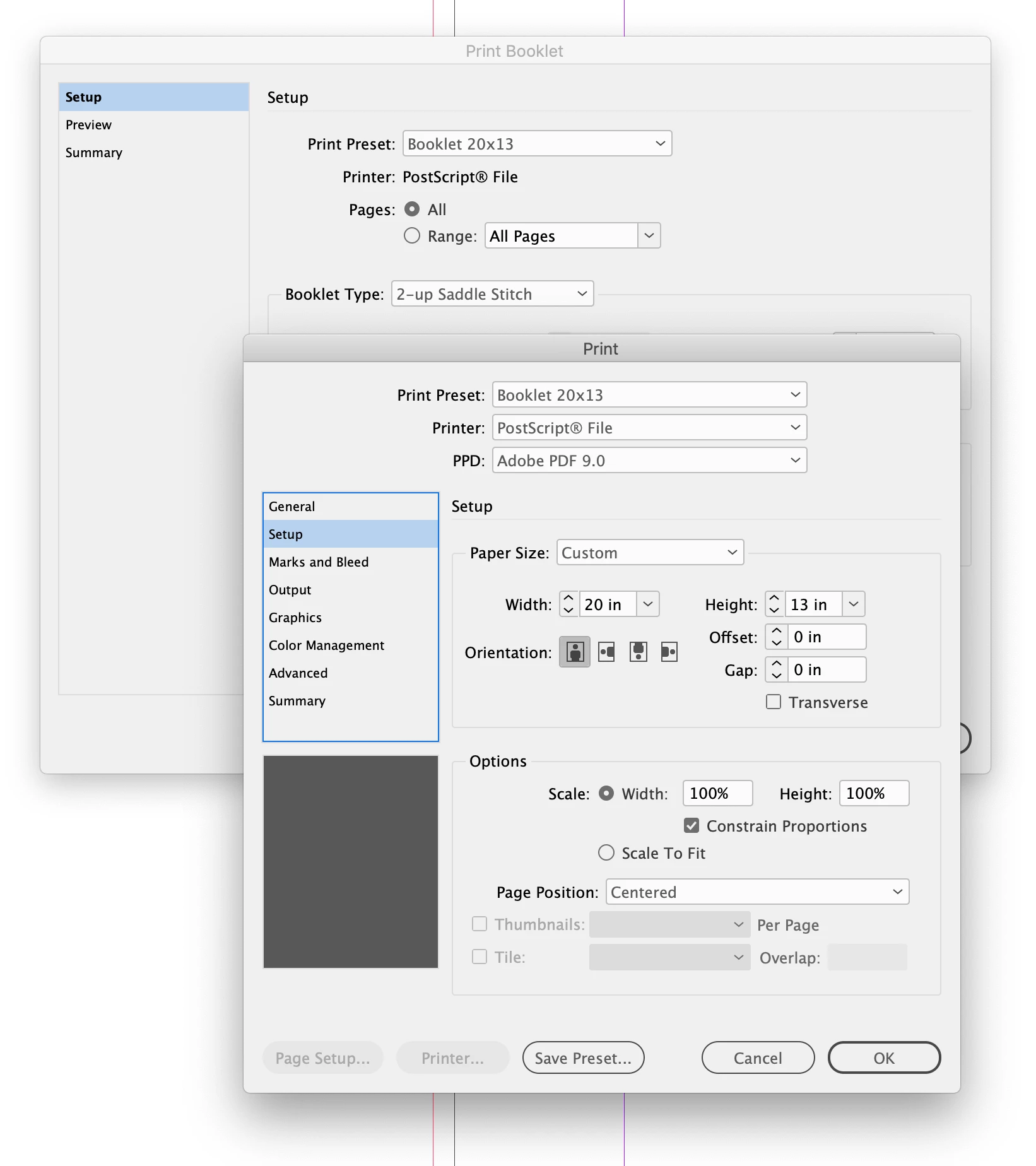 I have a document set up to print as a booklet with 5.5x8.5 pages on a spread. It looks fine in preview but the .ps file has the wrong page orientation. I've attached the Summary txt from Print Booklet.