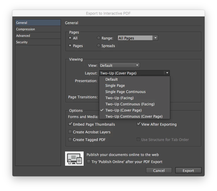 I would love to send my complete InDesign book as pdf in spreads for email review. Please let the first and last page of the book documents be exported as spreads, as if it was made in one document.