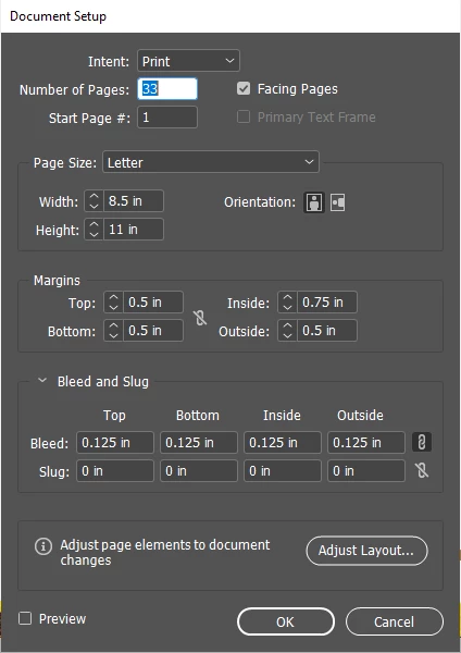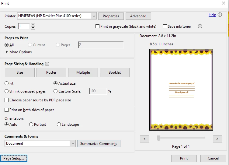 Please help me figure out why my document is not printing at the correct size. Document is set up at letter size 8.5x11 but when I try to print its the wrong size. In adobe it lists the size as 8.8x11.2 so even with my bleed set up page does not print to the edge. As well as page being incorrectly sized the bottom border is not printing as well. If you look at the print preview its greyed out at the bottom.