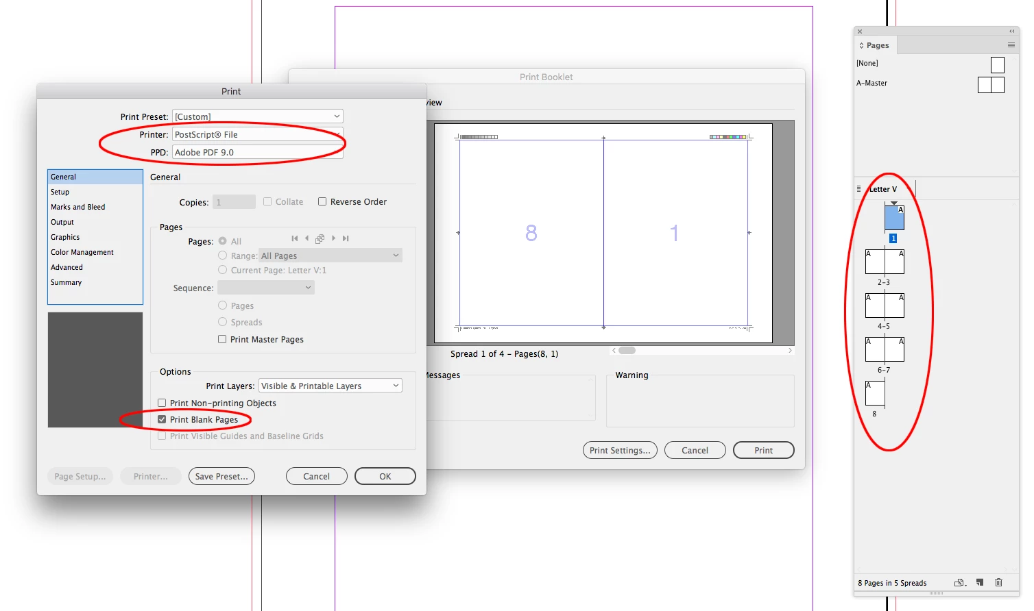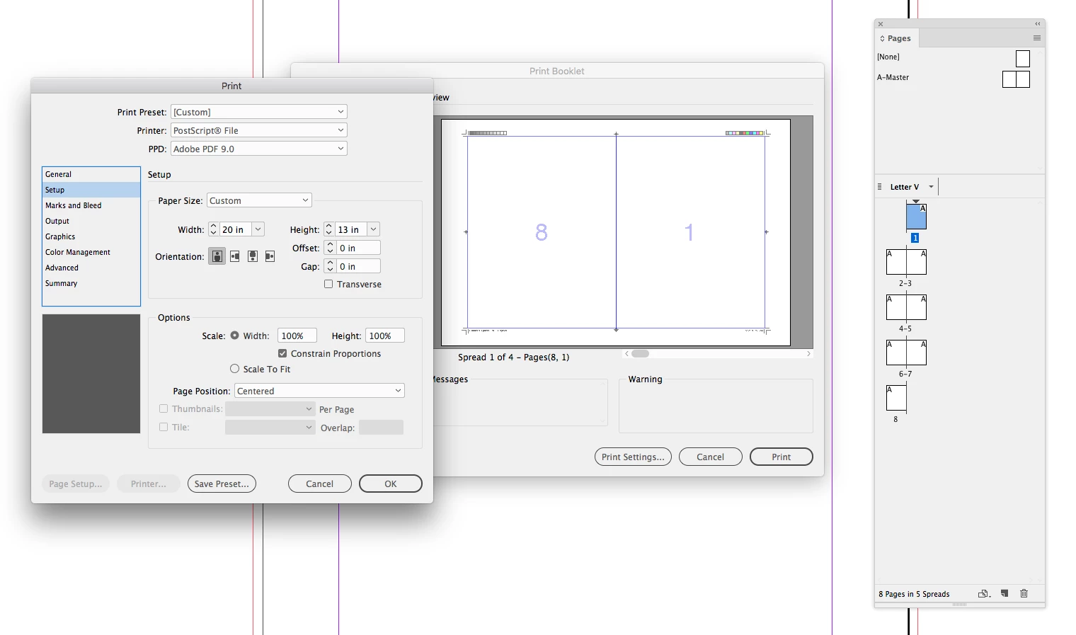 I'm trying to print a booklet. I've tried to print both directly to the printer and by saving as a PostScript File and opening in Acrobat and printing as a PDF. Even though I select centered in the print settings and appears to be centered in the preview once it prints or is viewed as a PDF it appears skewed to the left, so the pages do not line up when the booklet is folded. Here's my print summary, am I doing something wrong? Thanks for any help!
