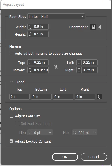 I am not a total newbie to InDesign or several other Adobe products. I have completed the Adobe sponsored tutorials in both InDesign and Photoshop (working on another one). However I am having and issue with changing the size of all the pages in an InDesign document. This is a family cookbook shared by many family members. The document in question is formatted for ½ page layout (4 ¼” by 5 ½”). I want to reformat them to 5” by 8”.