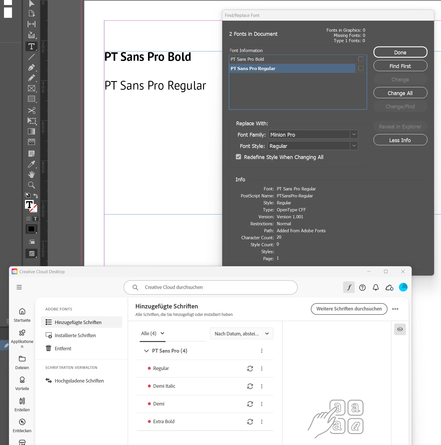 Hi @claudia2323 , The Adobe Fonts get activated not installed. Adobe Type offers a version of PT Sans which is different from Google’s version—your problem has come up before from users mixing the Google (installed) and Adobe Type (Activated) versions.