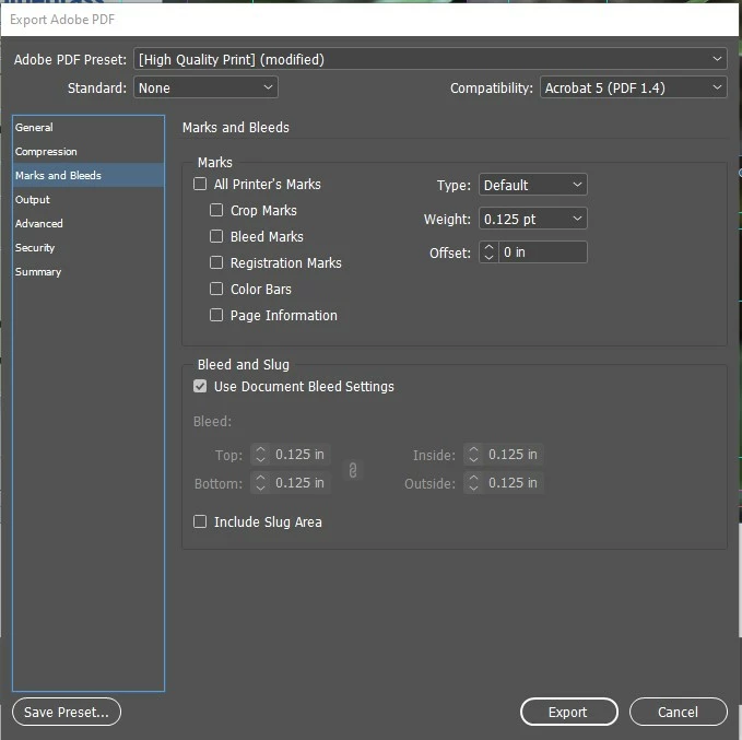 4.) Export hi res pdf with bleed - (bleed settings .125 on all 4 sides)