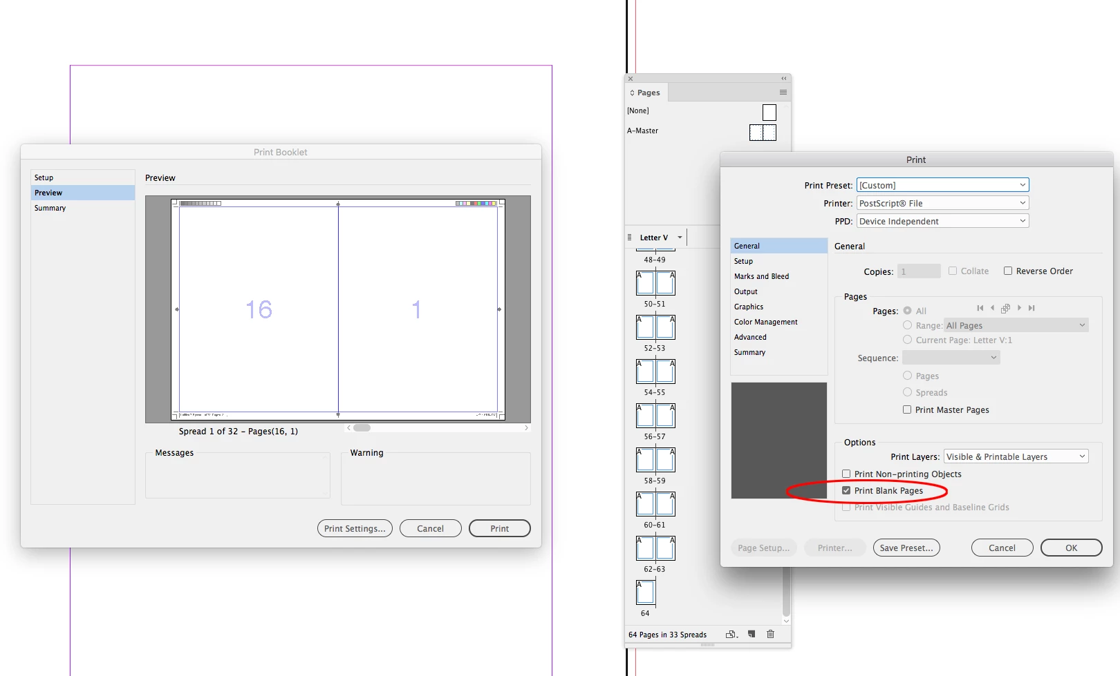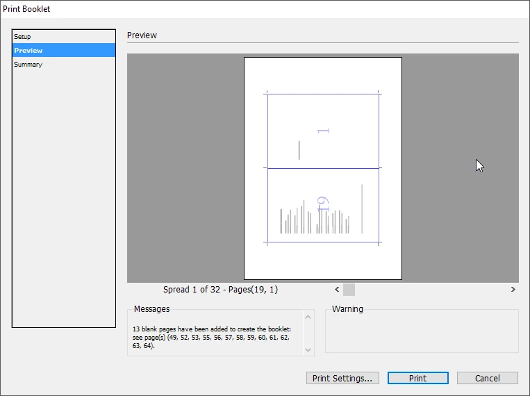 I need to create a 64 pages book (33 spreads?), and I have a problem with the option "print booklet" because it keep adding blank pages and I don't know how to fix it.