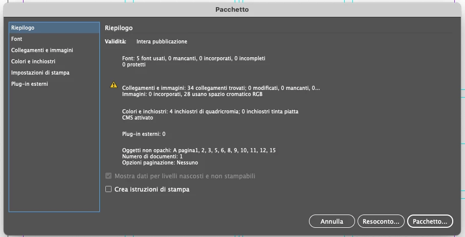 Le immagini risultano tutte correttamente collegate, l'unica segnalazione di avviso che trovo è la seguente, sembra quindi esserci una mancanza di collegamento del profilo colore delle mie immagini inserite: