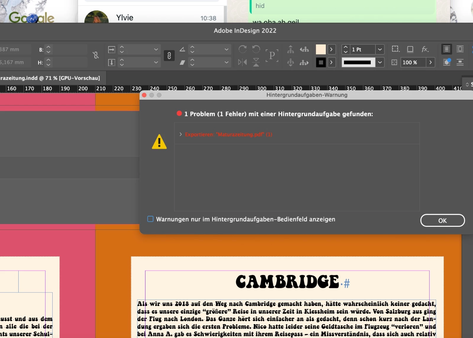 wir wollten gerade unsere Maturazeitung zum Drucken als PDF exportieren, hat vorher auch immer gut funktioniert.