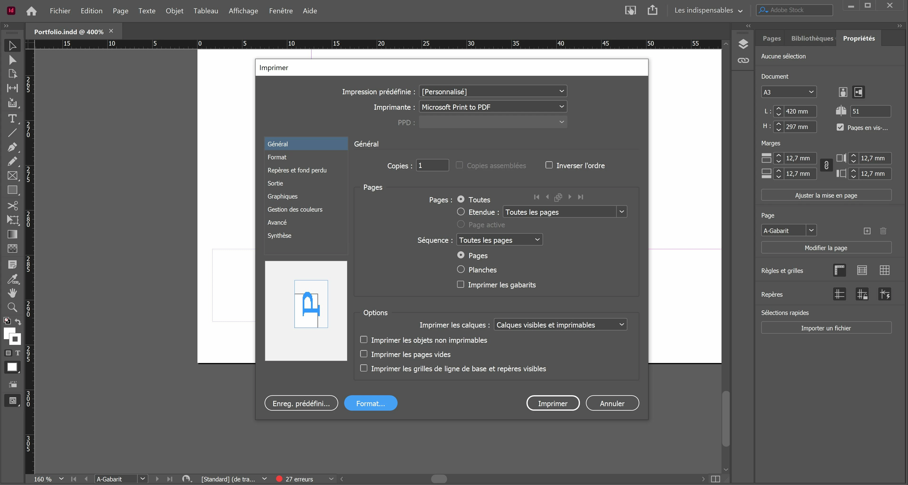 1.  l'imprimante est « Microsoft Print to PDF ». S'agit-il de créer un PDF ou d'obtenir une impression papier. S'il s'agit d'un PDF, il faut exporter le fichier, et pas utiliser une imprimante virtuelle