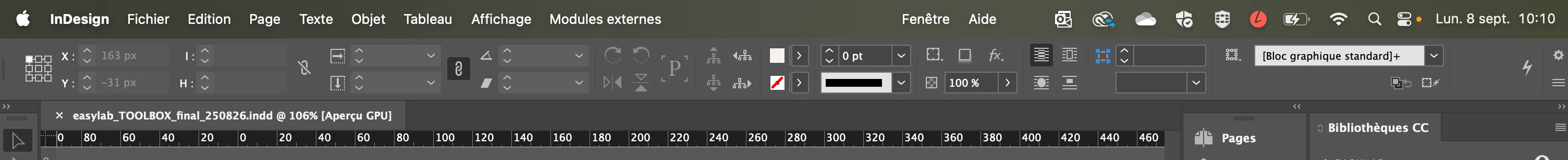 J'ai l'habitude de bouger ma fenêtre Indesign complète sur un second écran, mais depuis quelques temps je n'y parviens plus, les "boutons" de contrôle du haut ont disparu. Je suis obligée de faire flotter toutes les fenêtre et de les déplacer une à une, ce qui est très fastidieux et pas pratique du tout.