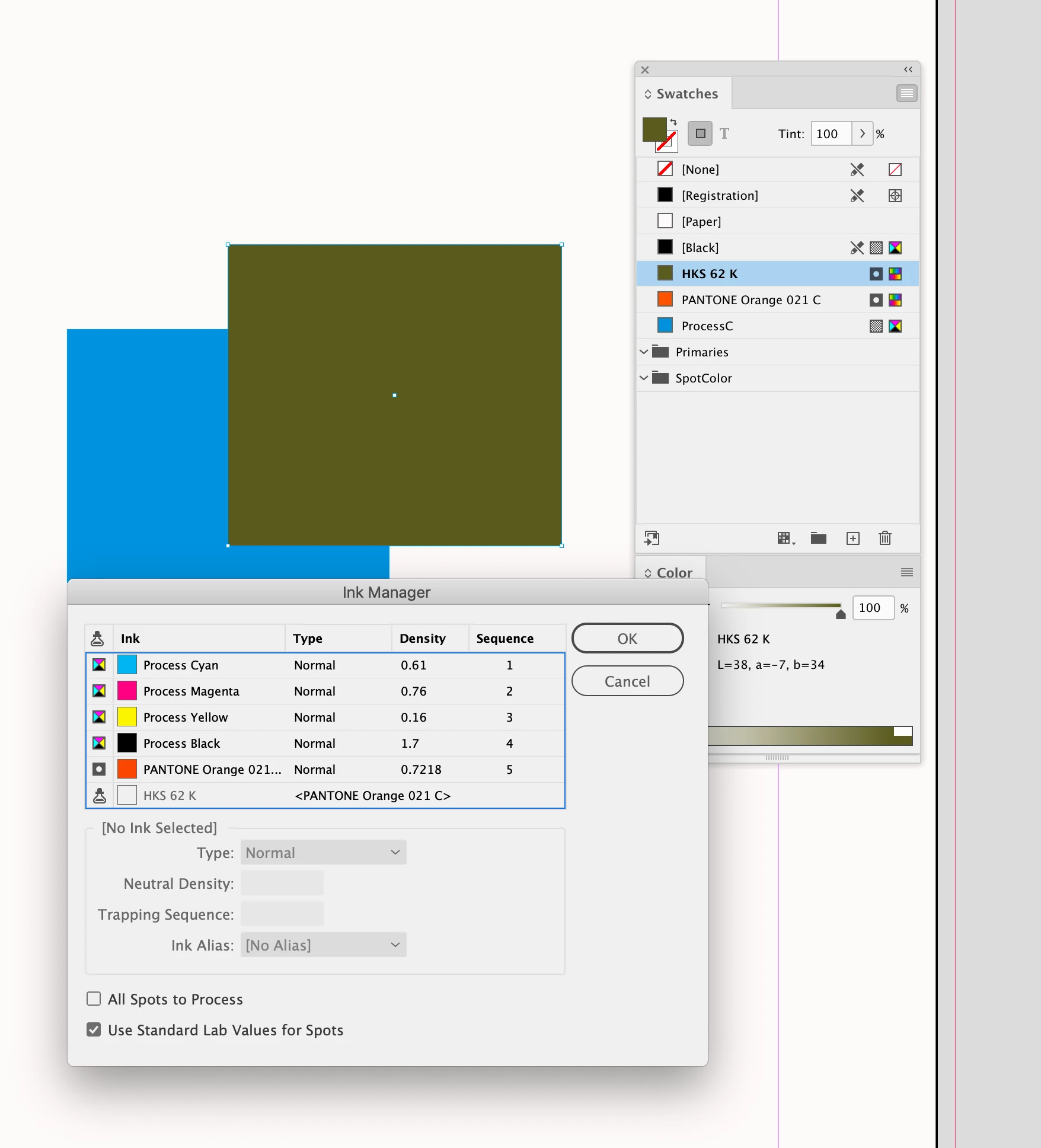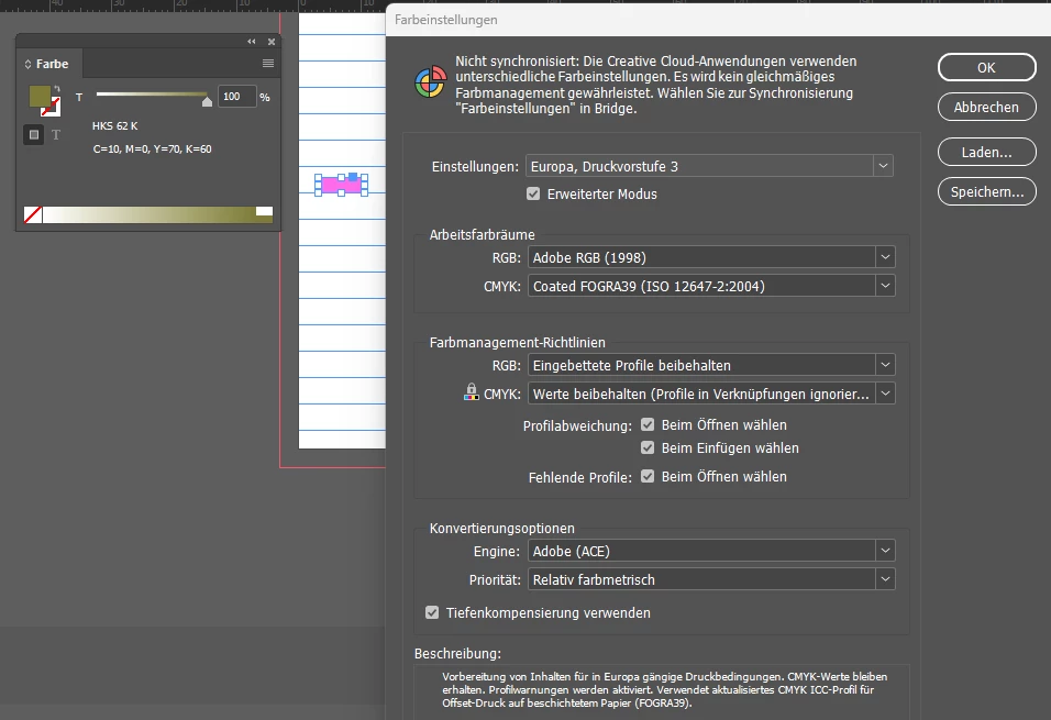 Hallo, ich habe ein Darstellungsproblem in InDesign in der Überdruckenvorschau: Die HKS-Farben werden hier nicht richtig angezeigt. Hat jemand eine Idee, was ich machen kann, damit die Farben richtig (so wie in der Farbpalette) angzeigt werden? Bei deaktivierter Überdruckenvorschau werden sie richtig dargestellt. Unten ein Screenshot mit dem ausgewählten, falsch dargestellten Objekt und den Farbeinstellungen von InDesign: