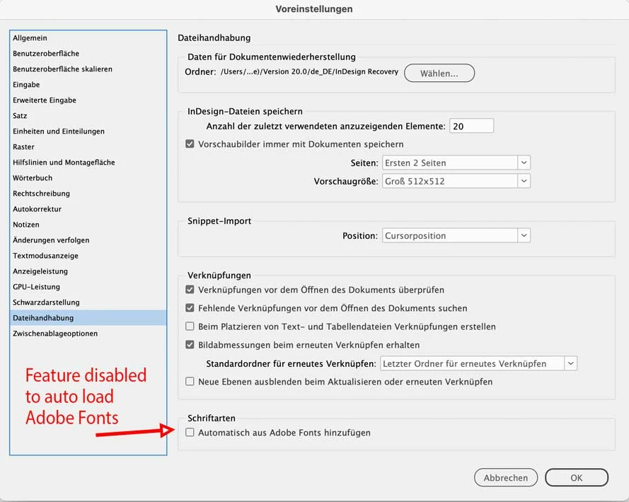 From my German InDesign showing the diabled feature in the File Handling tab: