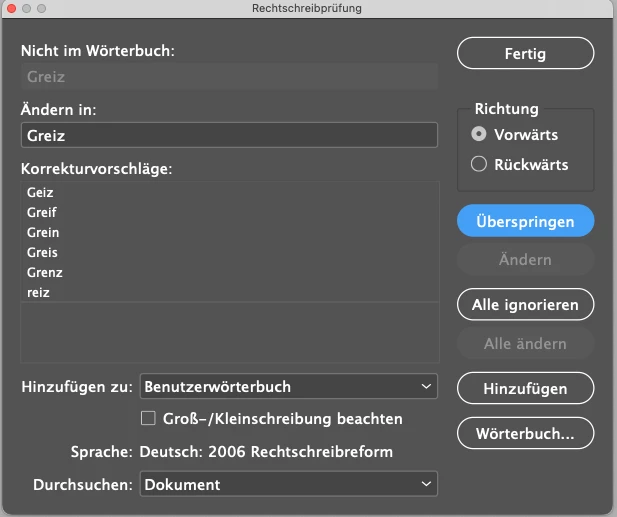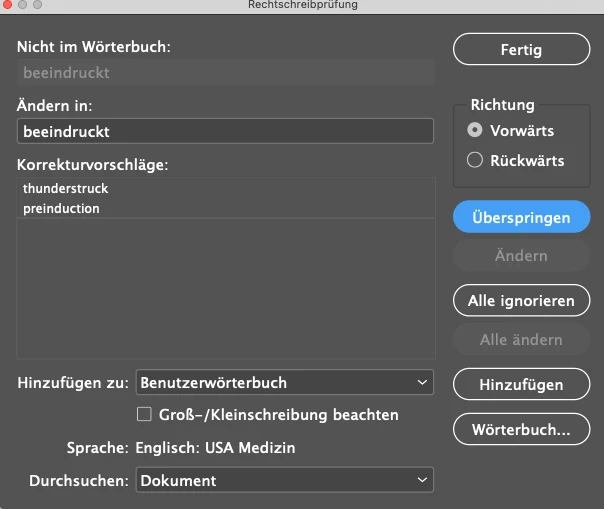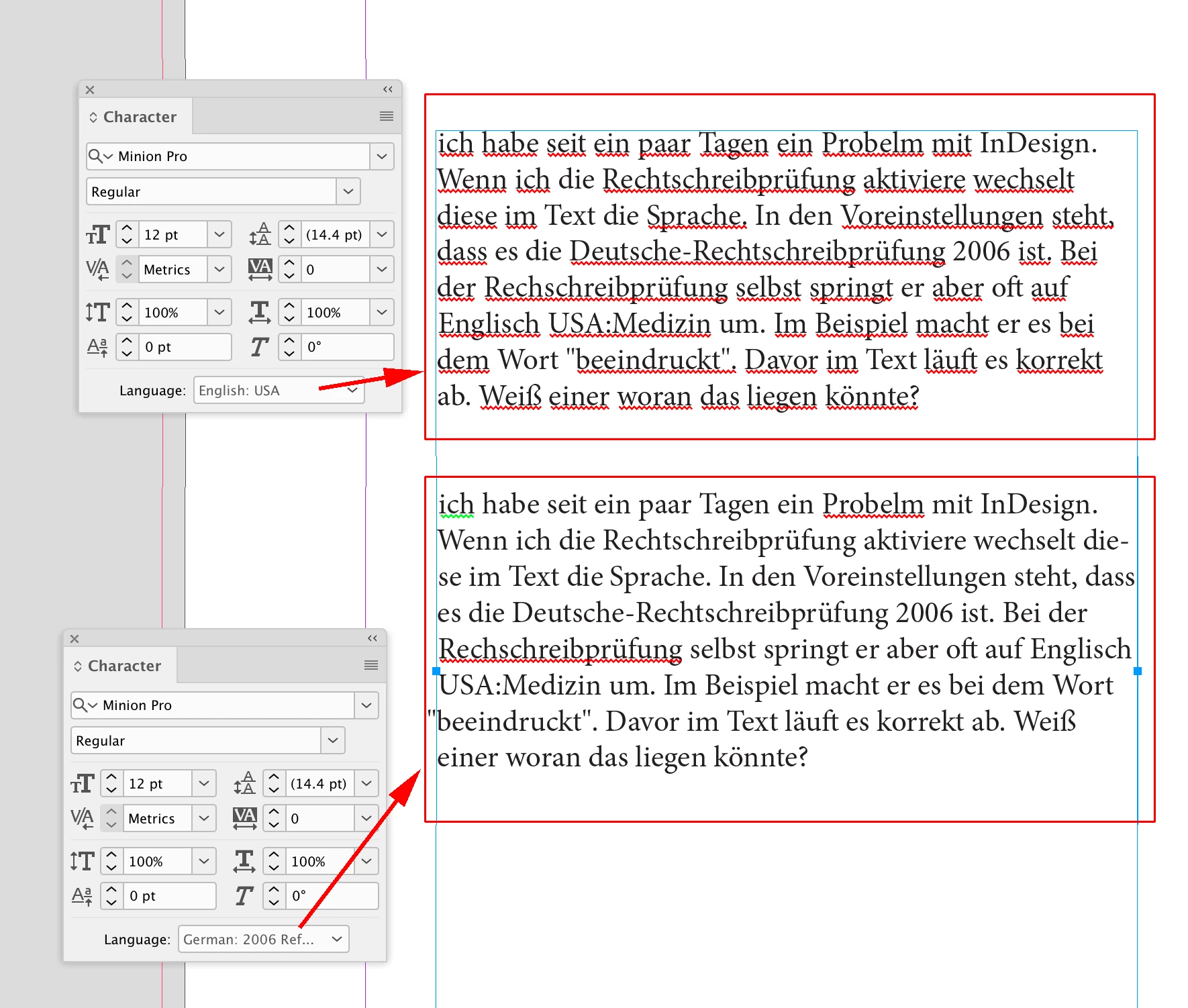 ich habe seit ein paar Tagen ein Probelm mit InDesign. Wenn ich die Rechtschreibprüfung aktiviere wechselt diese im Text die Sprache. In den Voreinstellungen steht, dass es die Deutsche-Rechtschreibprüfung 2006 ist. Bei der Rechschreibprüfung selbst springt er aber oft auf Englisch USA:Medizin um. Im Beispiel macht er es bei dem Wort "beeindruckt". Davor im Text läuft es korrekt ab. Weiß einer woran das liegen könnte?