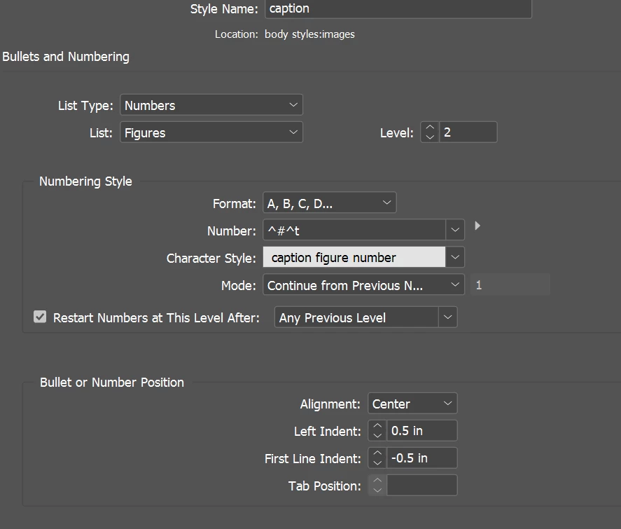 Now, set your figures paragraph styles as a numbered list too. Make sure it uses the same List*, and that it is set as level 2.