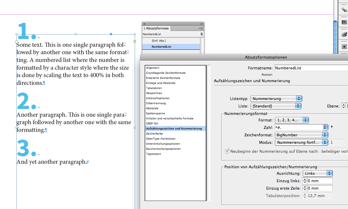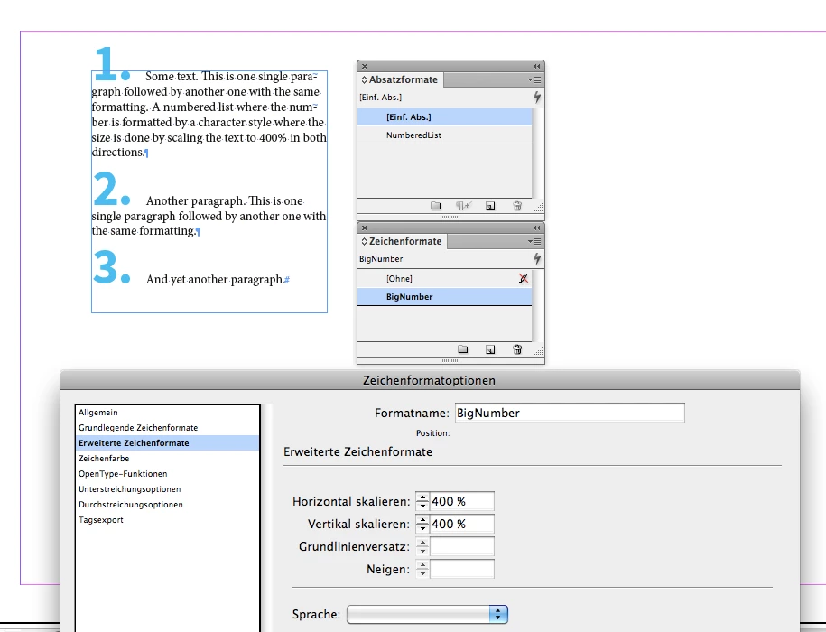 The paragraph style is using a numbered list where the number formatting is defined by a character style that is using a different font and the characters are scaled horizintally and vertically.