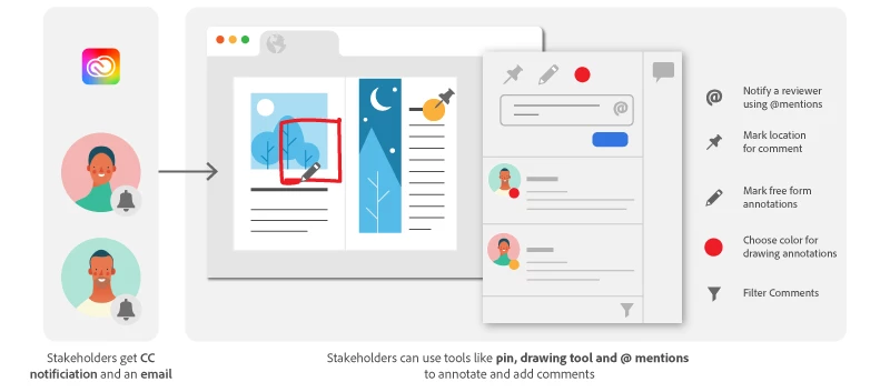 You can review the shared documents and share feedback with designers by adding comments, using a commenting pin, using the @ mention and drawing free form annotations.