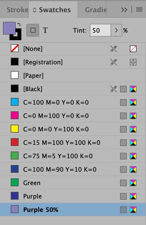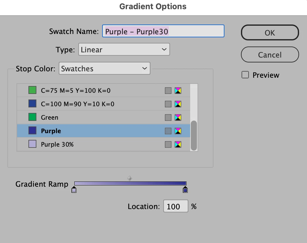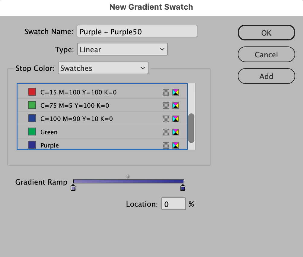 It's more accurate to start by creating swatch colors for the colors your want to include in the gradient. I created swatches which are Green, Purple and a Purple Tint (using New Tint Swatch):