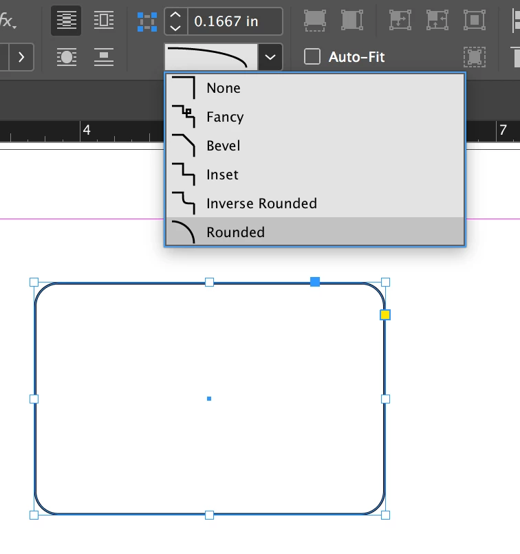How can I do this in InDesign? In Illustrator, the little blue dots appear which let you pull the corners to become rounded, but I can't see anything like this here.