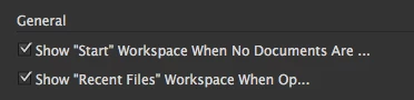 A couple of more quirks: 1. The first Workspace toggle option seems to also control the following toggle option of displaying 'Recent Files'… instead of just the workspace; 2. The shortened descriptions of those toggle/checkbox options don't provide a pop-up that expands their context completely and they're also cut to a point that's 2/3 of the width of the Preferences panel window—strange, really.
