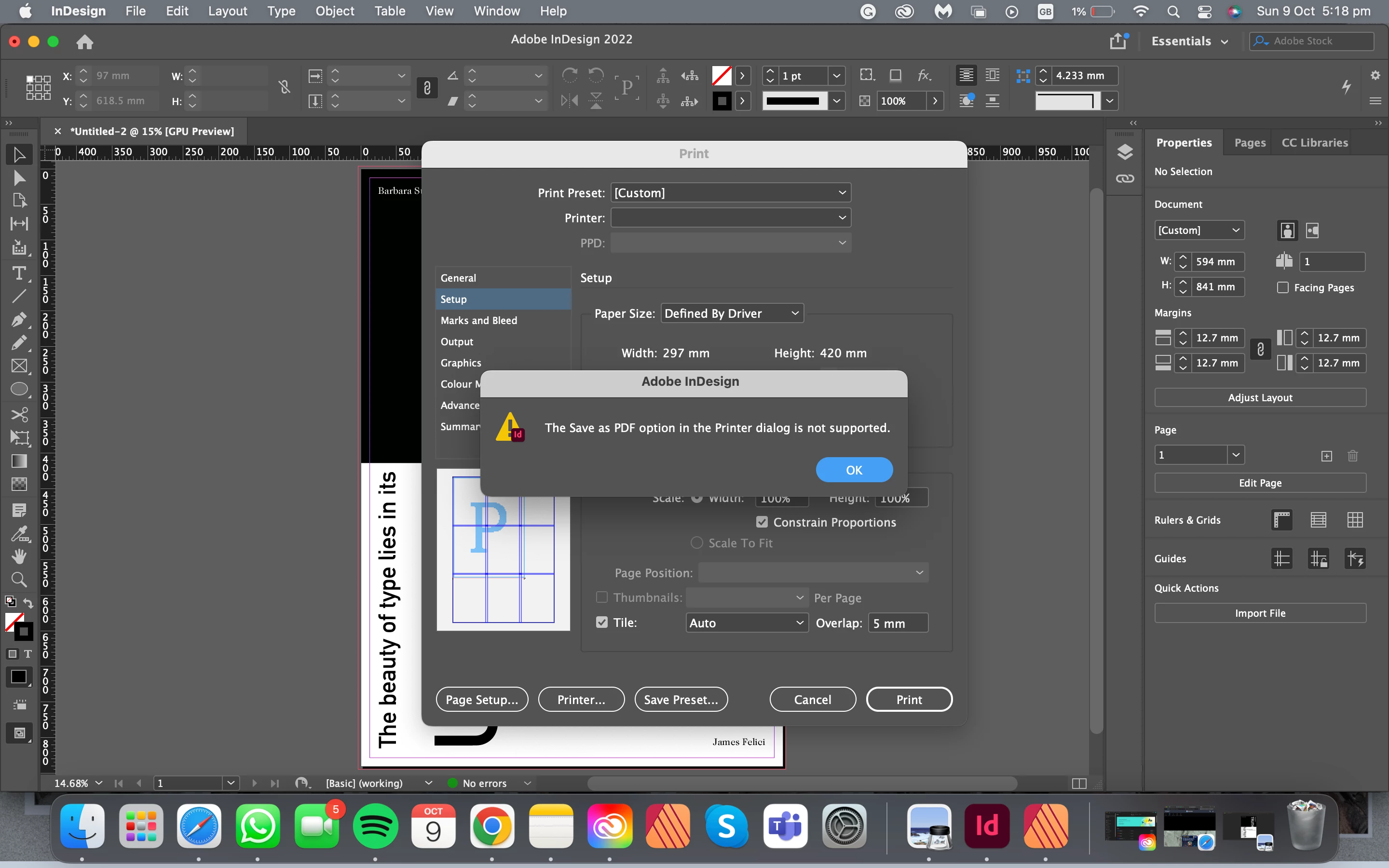 I am doing an A1 print using a tiled format to print (using 4 A3s). I did the tiling settings using the print settings and then tried to save that as pdf which I could do in affinity but I recently made the change to indesign. but when I tried to do that in indesign it says it's not supported. I was wondering how I could fix that or save my tiled version as a pdf so I could print it in my unis printer (it has to be printed as a pdf).