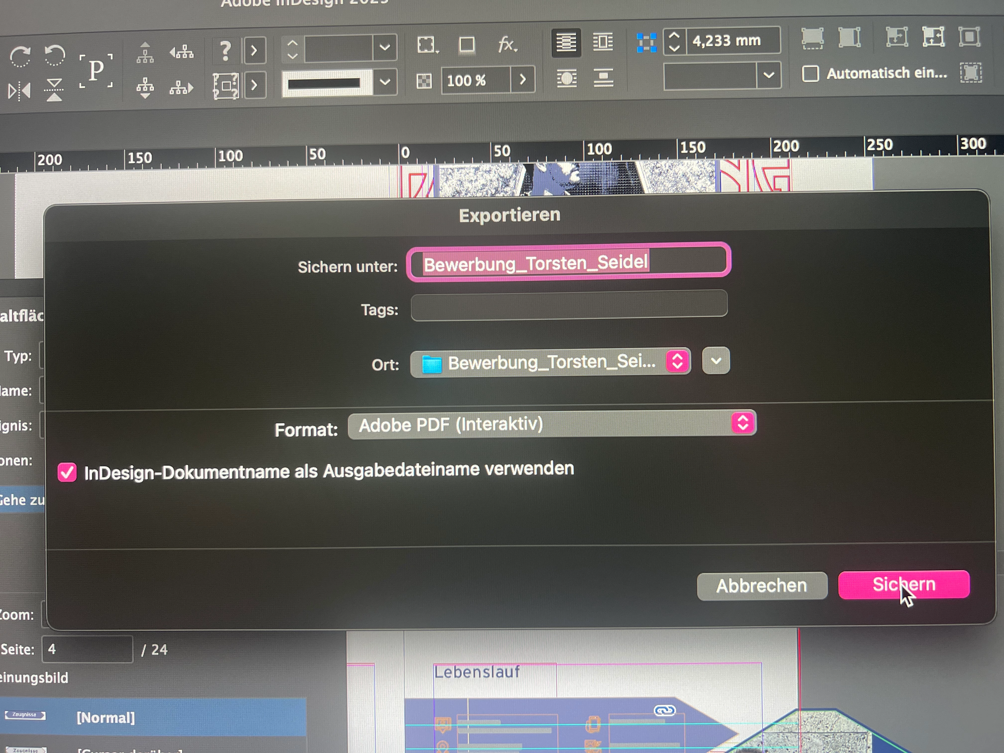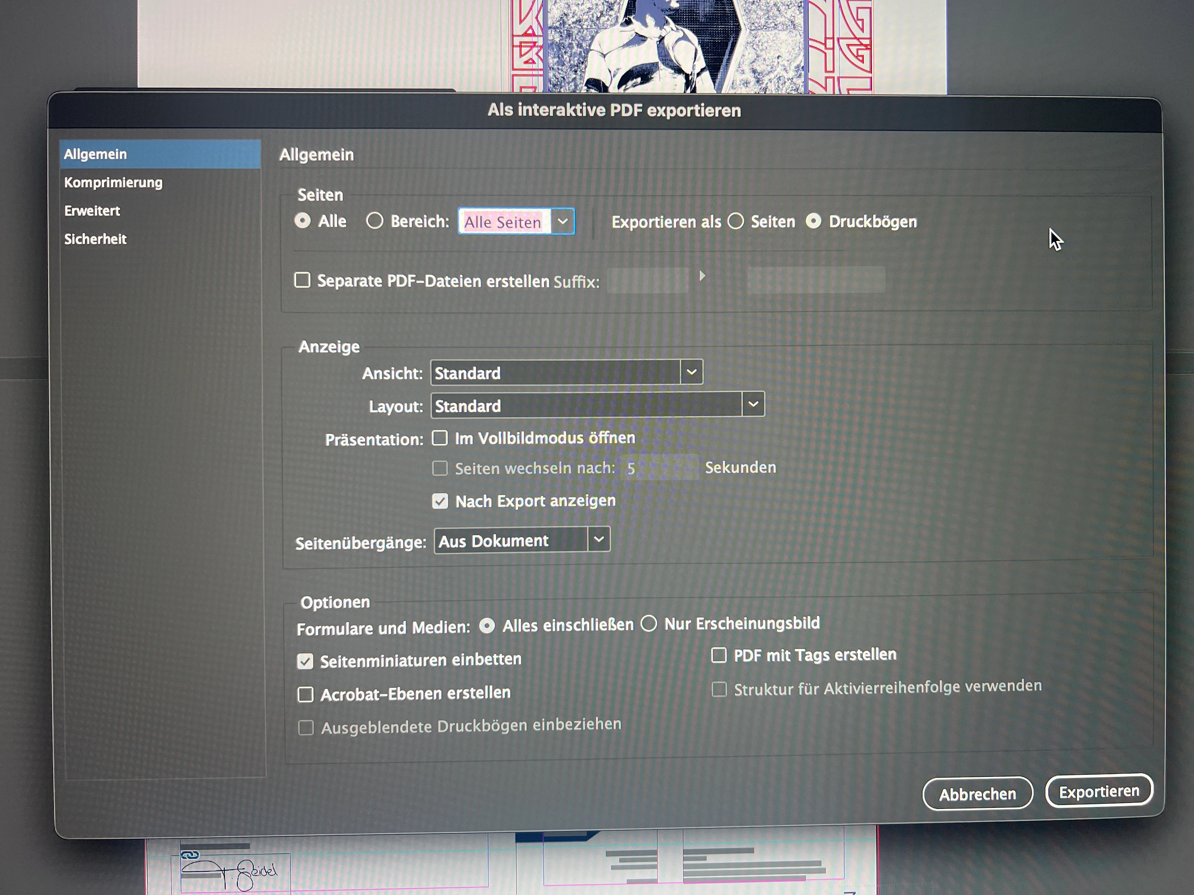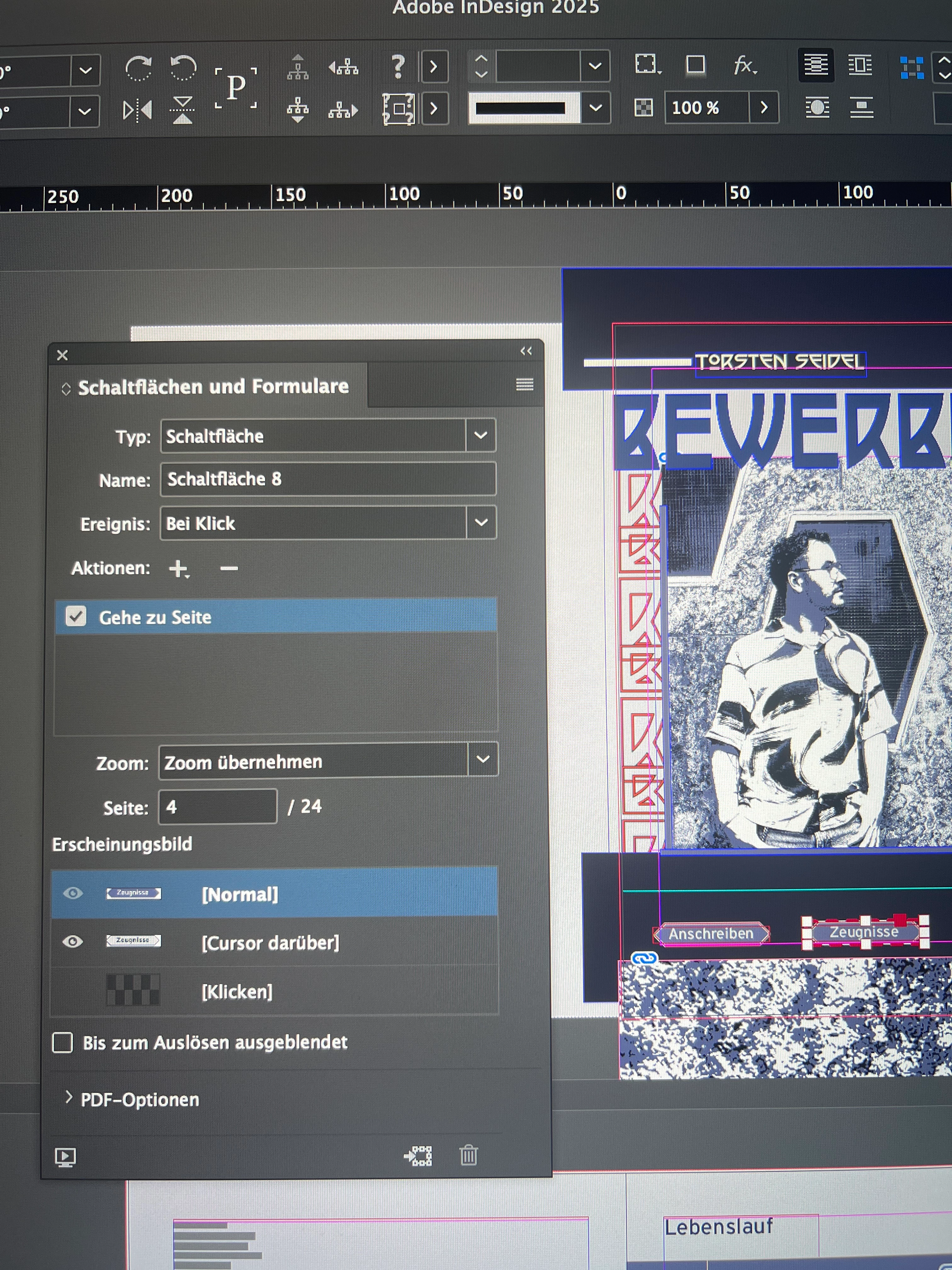 Ich versuche gerade eine Bewerbung für mich zu gestalten und wollte dabei eine Interavtive PDF machen. Dabei habe ich Schaltflächen angelegt. Diese funktionieren auf allen Seiten außer auf der 1. Seite. Ich hab kein Plan was das Problem ist. Wenn ich es in der Vorschau Öffne funktioniert alles. Aber sobald ich es Exportiere geht nur die 1 Seite nicht. Die Rolloveranimation funktioniert allerdings einwandfrei? Nur das Weiterleiten auf die jeweilige Seite geht nicht. Ich hab euch mal dazu ein Bild meiner jeweiligen Einstellung dazugepackt. Pls Help me❤️