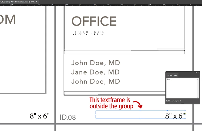 Page 1.02 of your sample document, the ID.08 link has a parent group with the expected code frame, but the dims frame is not part of that group, as it should.