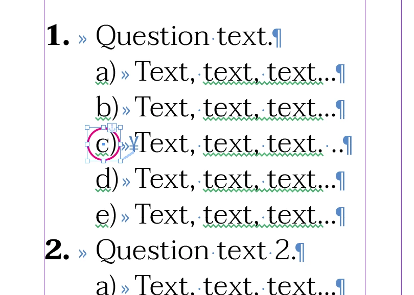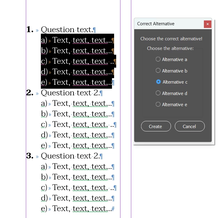 I select the text with itens (alternatives) and run the script. The script will ask me which answer is correct. I choose an answer (from 5 options), and it will create a circle over the selected item and anchor this circle right at the beginning of the text.