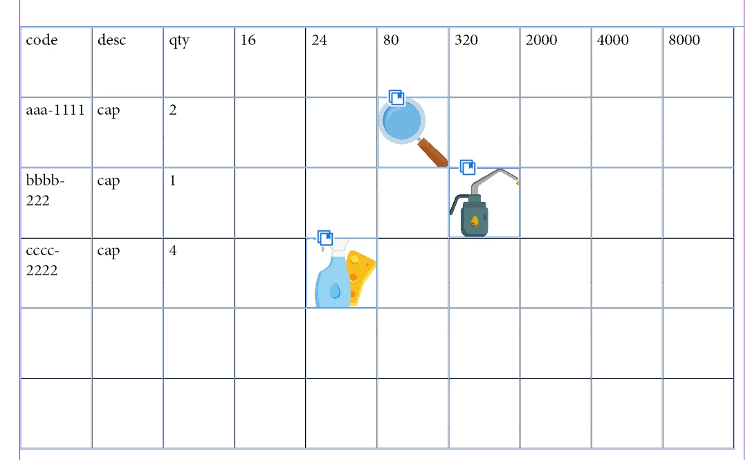 I would like to find the common codes between the two files, read the letter and the number from the file maintenance.txt and insert them in a table in indesign, as attached, so that the code is inserted in the first column, and based on the letter insert an image in the cell corresponding to the number (equals the hours of maintenance)