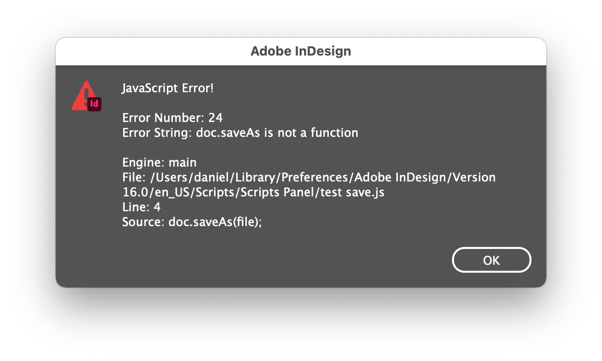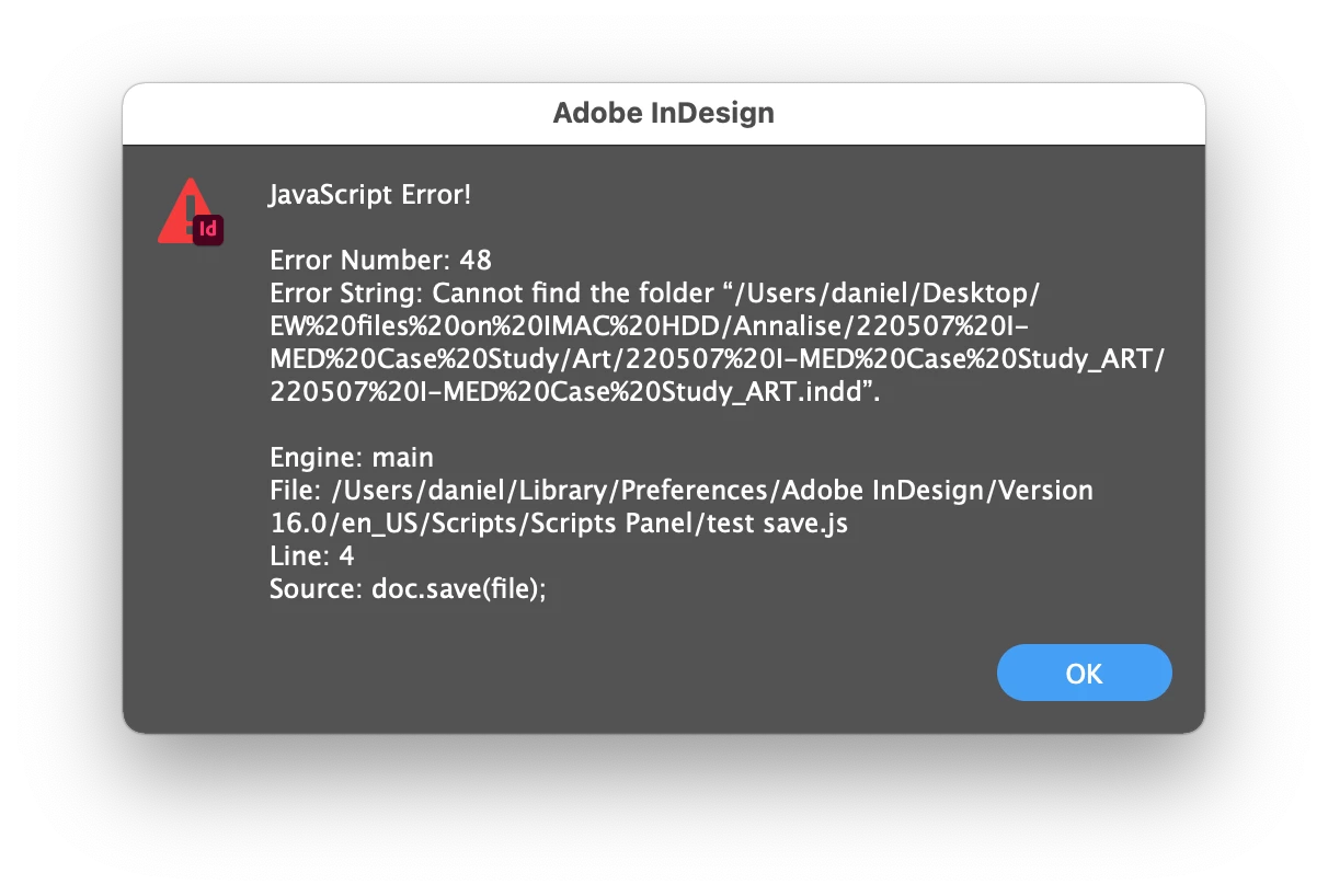 I tested on an indesign document placed on the desktop and it ran without giving me the error. However, it created a copy on the desktop and replaced the spaces in the filename with %s.