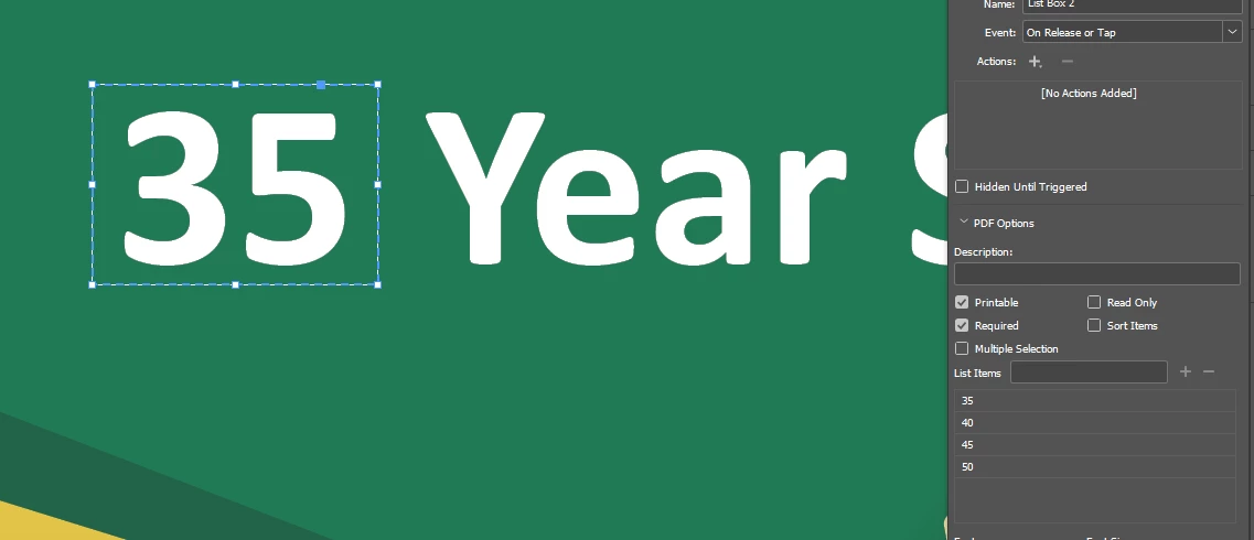 after i did put in the year options under list box, the text is not white color as i expected in the final PDF, and the text box is hard to be centered.
