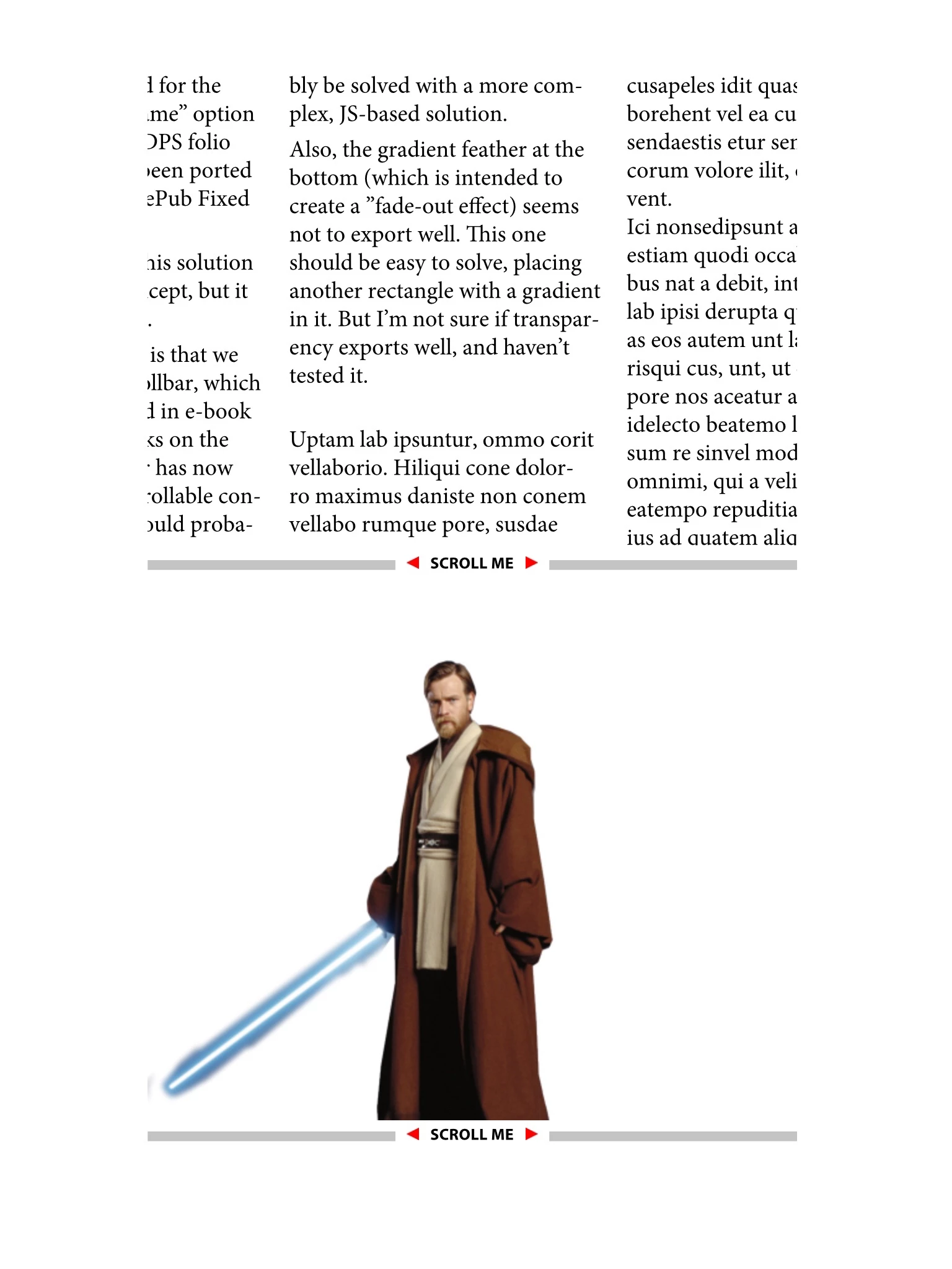 An obvious problem is that we use basic HTML scrollbar, which is not being displayed in e-book readers such as iBooks on the iPad. Hence, the user has now idea how long the scrollable content stretches. This could probably be solved with a more complex, JS-based solution.