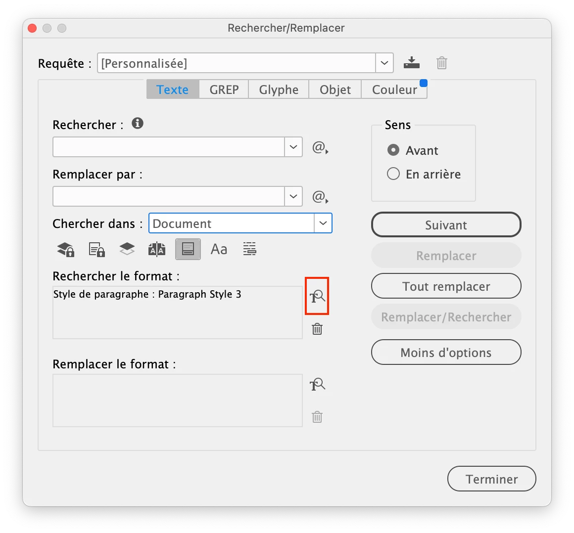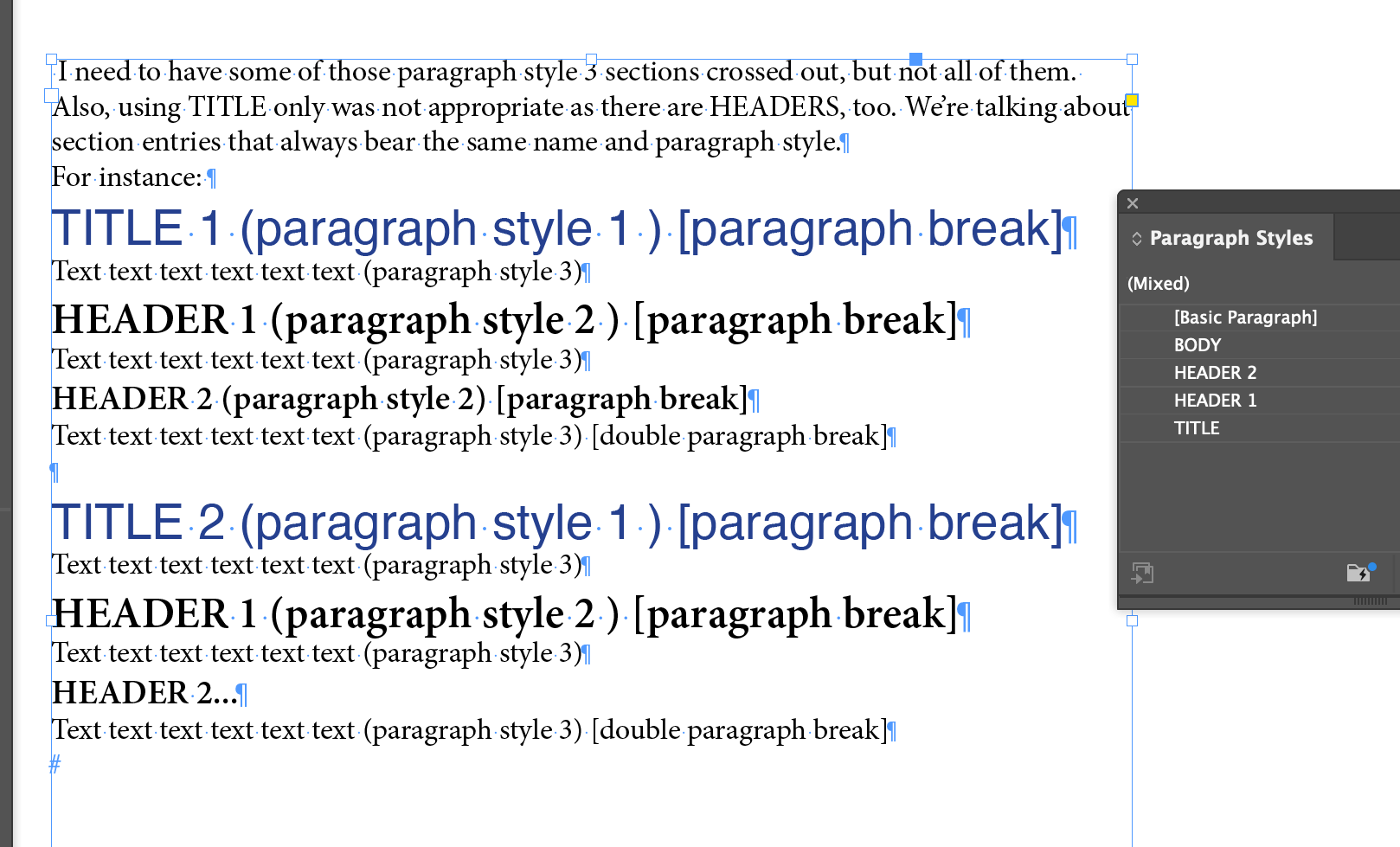 For a bibliography I'm working on, I'd need to select all text between paragraph styles and have that text crossed-out or have the formatting changed so that it won't be picked up by an indexing program.