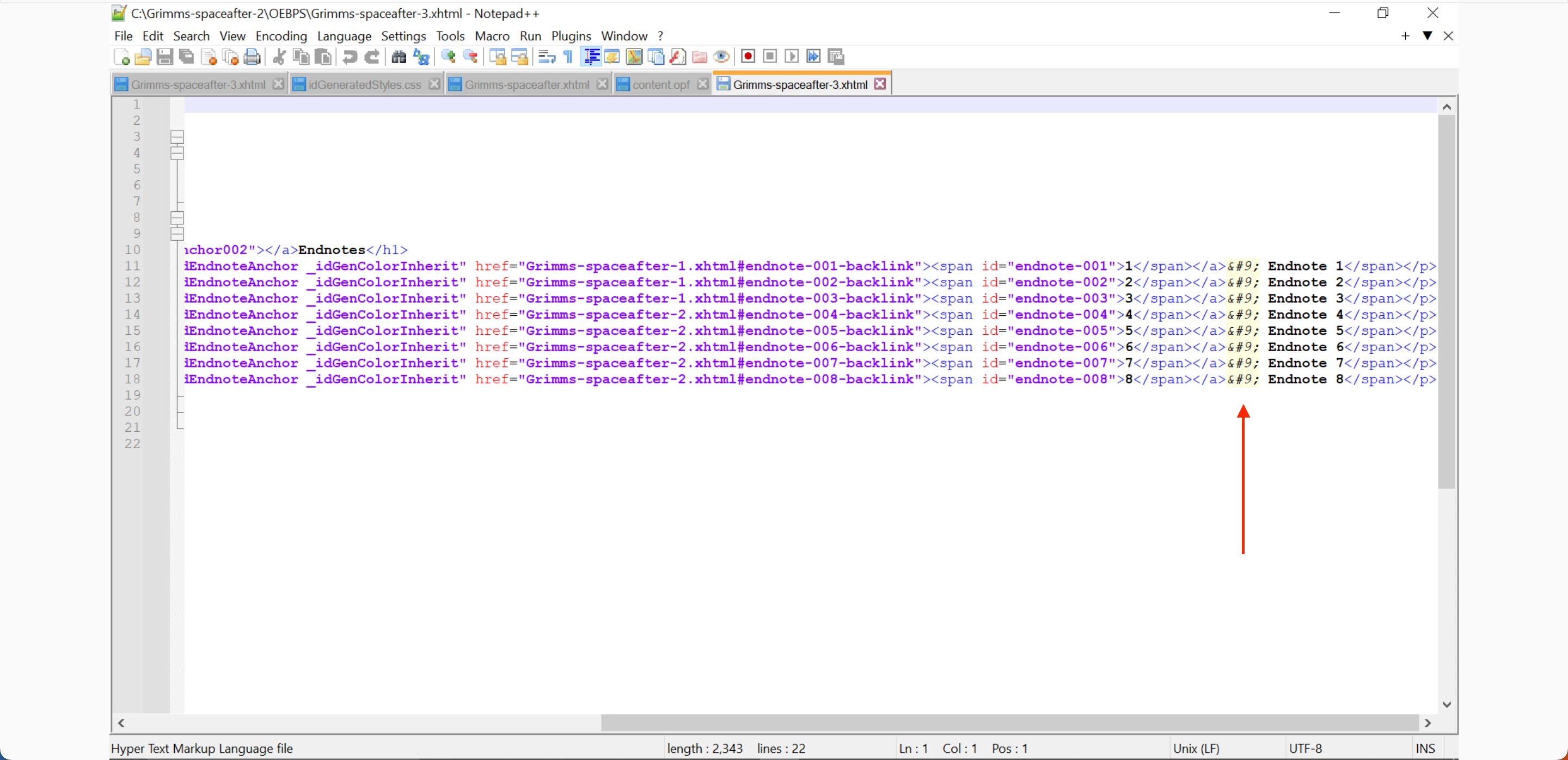HTML and ASCII 9 is a tab. Tabs are not recognized in EPUB, just as they aren't in web pages. That '^t' is either ignored or converted to a single space.