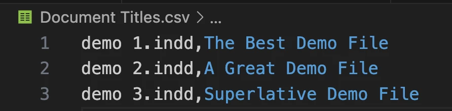 The script loads this CSV, then it looks to see if any of those documents are open in Indesign and, if they are, will set their document titles and save/close them. It will not close any documents that aren't matched in the CSV file.