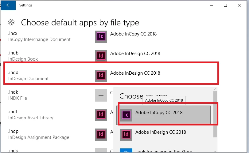 Setting InCopy CC 2018 as default program to open InDesign CC 2018 files on PC