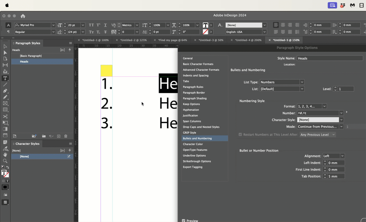 I have numbered section headings and I want to create a tab space between the number and the start of the text. So I have gone into the para style tab button and set a tab at 5mm. However, if I then go back to the text and enter a tab character, the distance is 25mm. Is there some minimum tab setting that I have to change or am I doing it all wrong?