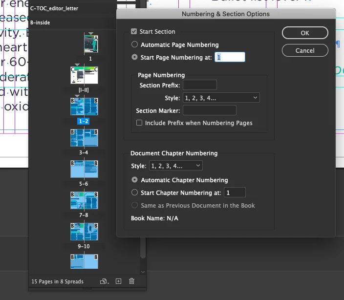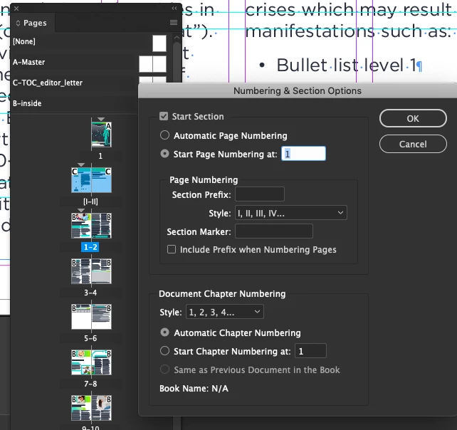 I'm adding page numbers (Next Page Numbers) to a 24 page booklet (with spreads), I'm then right-clicking on the page that I want to start the page numbers from on the Pages tab, I then deselect 'Allow Document Pages To Shuffle' and 'Allow Selected Spread to Shuffle', then 'Start Page Numbering' at number 1 but when I click on 'OK' I get this message, I can't seem to get rid of it, can anyone help please, I don't want to set my document up incorrectly?