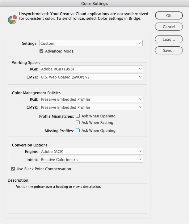 The RGB Working Space you choose in Color Settings should be a display profile that isn't your monitor profile. The common RGB editing spaces are sRGB, AdobeRGB, AppleRGB, and ProPhotoRGB. Derek recommended sRGB, but it is a smaller space and doesn't include a significant part of the blue and yellow spectrum that inkjet printers are capable of printing, so I would think you would be better off with the default AdobeRGB.