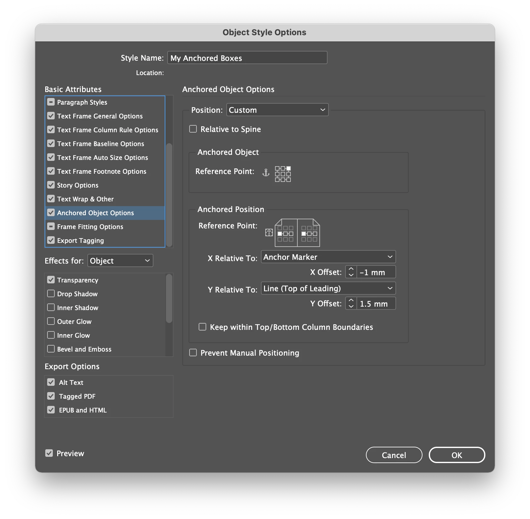 Important: if you do it this way, you *must* set up an object style for your boxes. The style can set all the anchored options I mentioned but also the stroke width and color etc. See second screen shot.