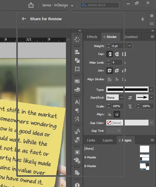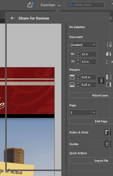 Every time I open a document, InDesign ghost-opens the "Share for Review" box, but it's litterally empty and it's under the workspacebutton instead of the share button.