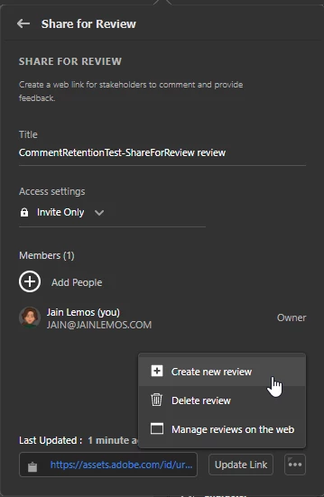 Another way to make a new link from an original document is to select "Create new review" from the review menu. You will be creating a new link, but without copying previous comments. To access your previous reviews, go to assets.adobe.com.