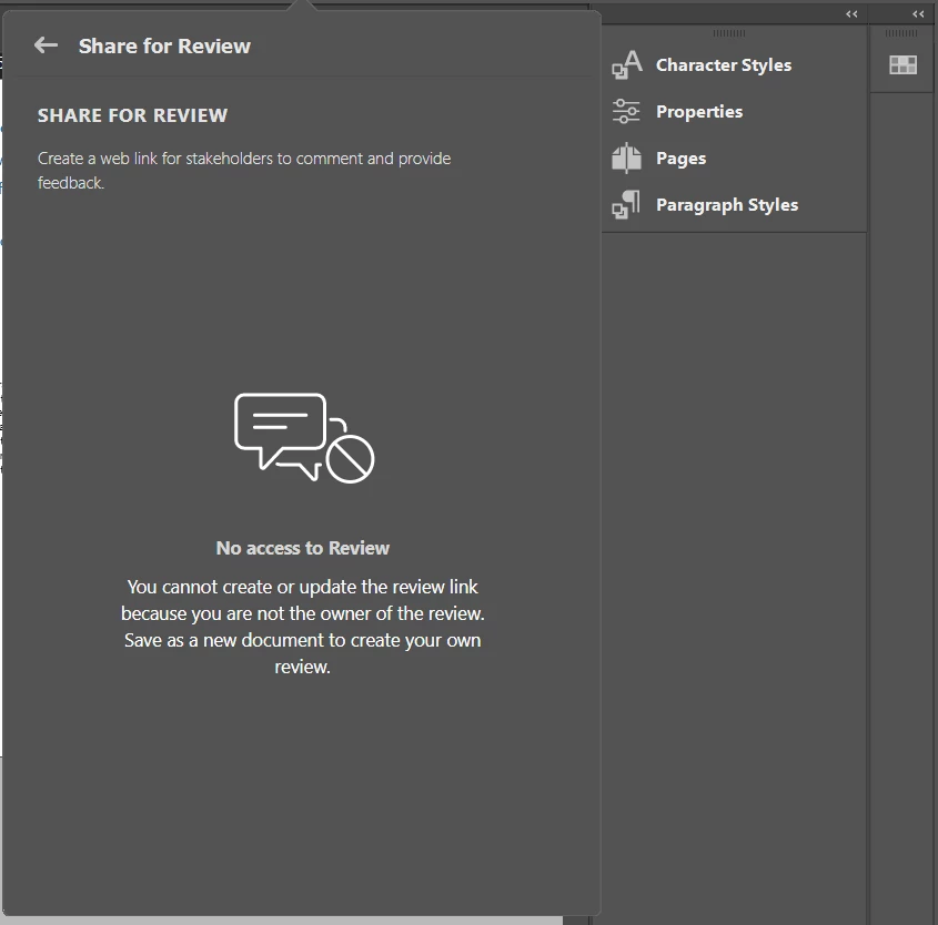 I packaged the InDesign file with a new name, shared the link to stakeholders again, but Share for Review is blocked again/not available to update.