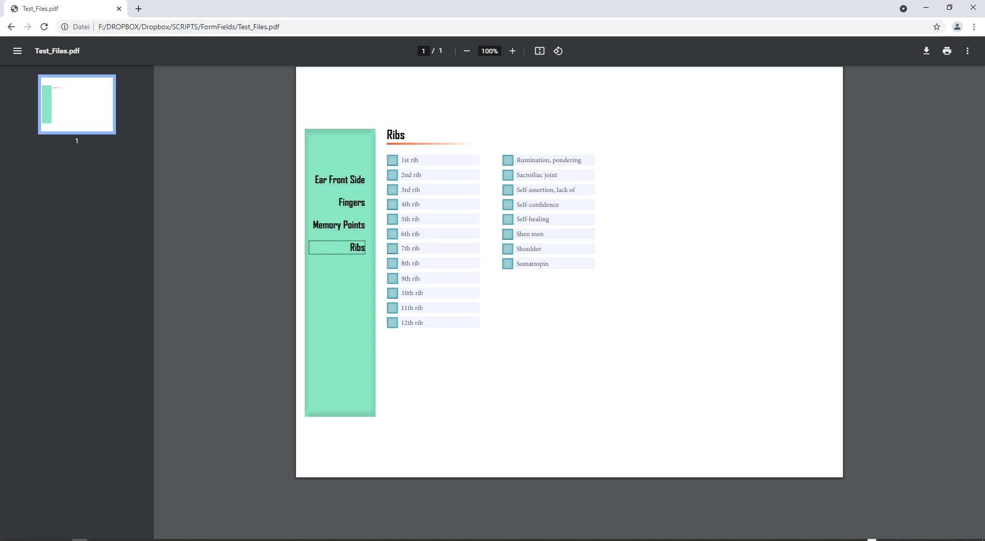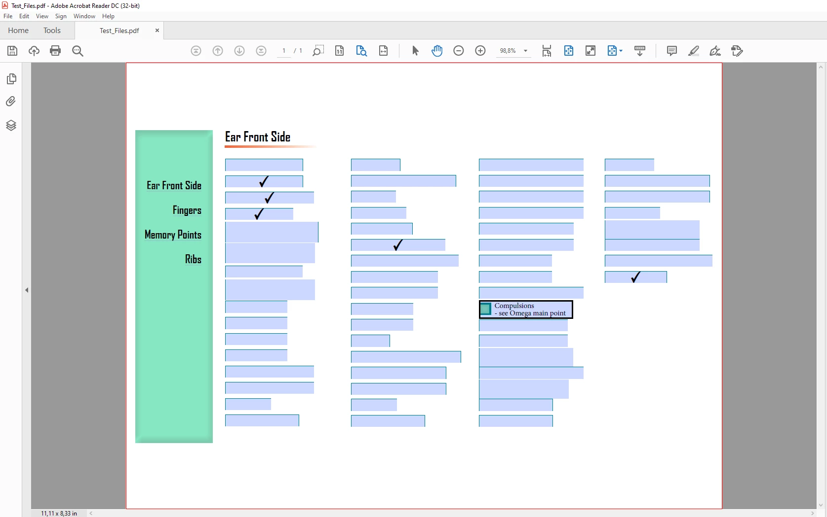 I have created a PDF with menu items, when I click on each menu, the corresponding check boxes will appears on rightside area. This works fine for first two menu titles (Ear Front Side, Fingers) & not working for others. The same PDF works fine on Chrome, please check the attached PDF.