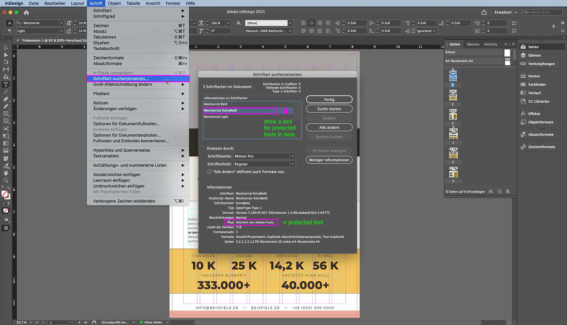 I want to know, which (Adobe) fonts will not be exported by "Datei > Verpacken" (File > Packing (?)). Where I gat the .indd, .idml and all images plus non-protected fonts. When I know, which font is protected, I can subsitute these by OFL fonts before exporting.