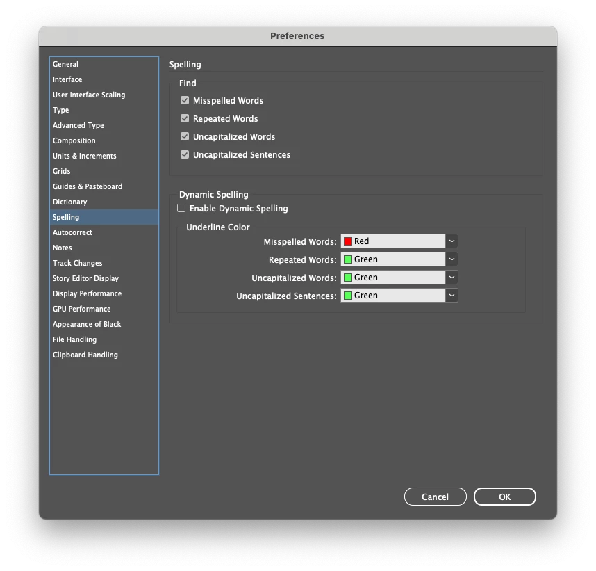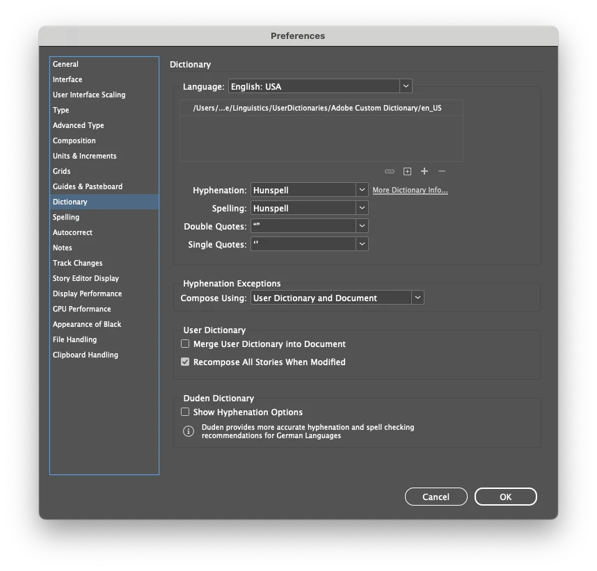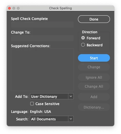 Currently using a Mac (OS Sonoma 14.5) with the latest verison of InDesign (v. 19.5). Attached are the images of my preferences (spelling and dictonary) as well as the Check Spelling window. I'll hit "Start" and nothing happens. I even intentionally misspelled something to see if it would work. Nothing.