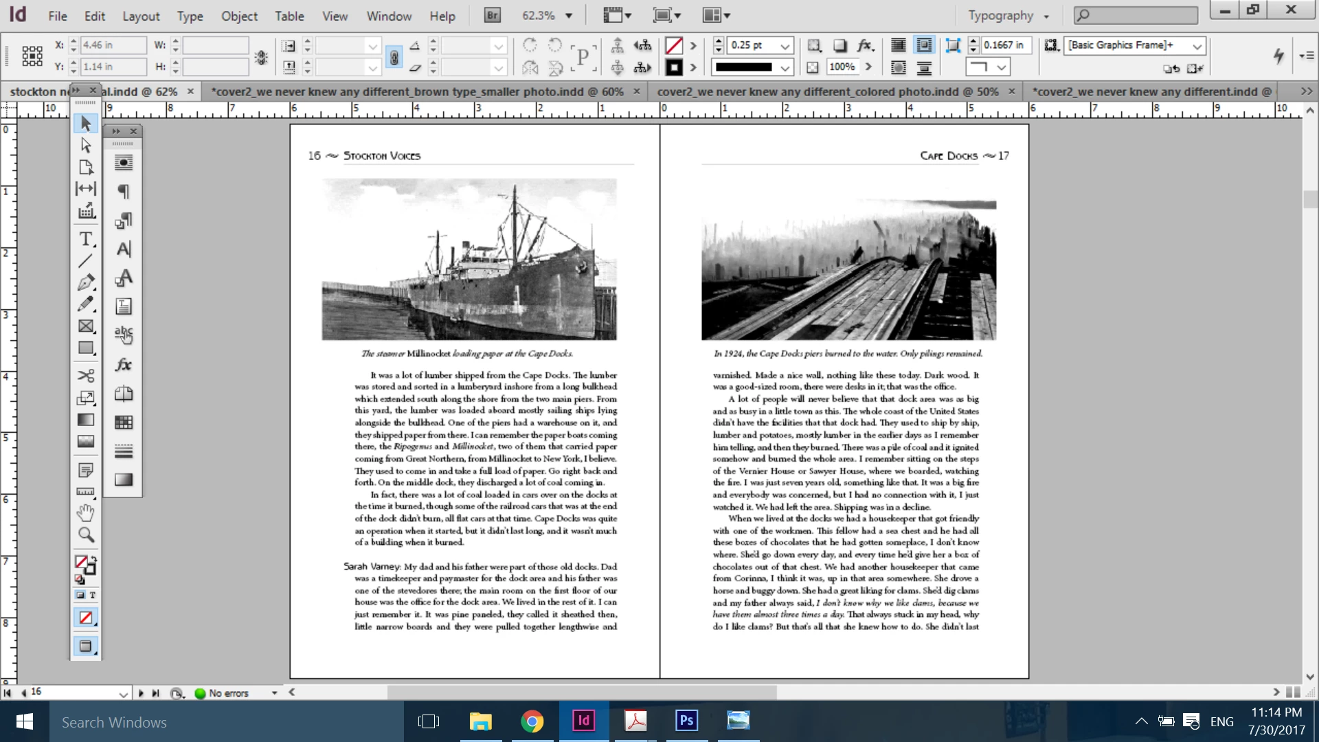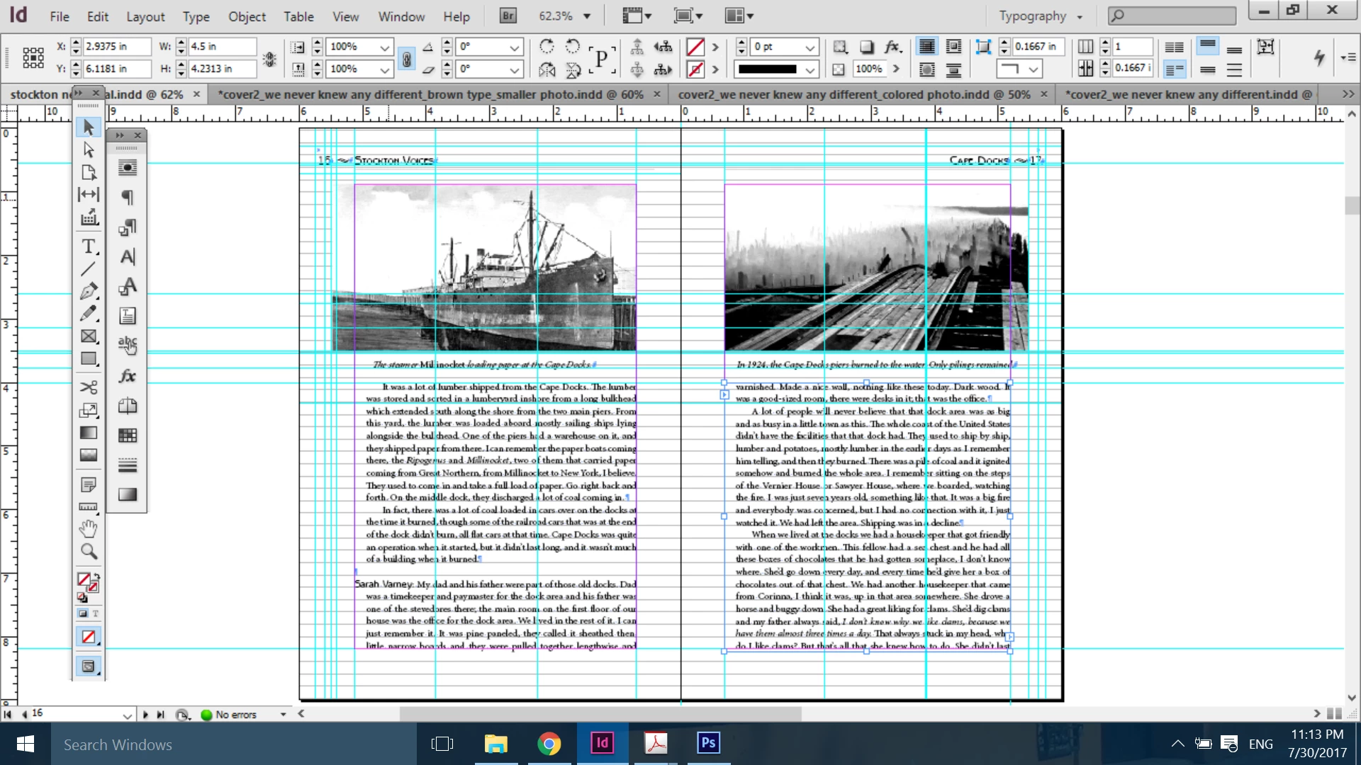 Hi - I have a proof of a book. The pages line up on my indesign file, but when printed, the content of the right-hand page is about 1/8 of an inch below the left-hand page. Why? And how can I fix - any ideas? I'm working in cs6. I'm attaching two screenshots, one with the guidelines, one without...
