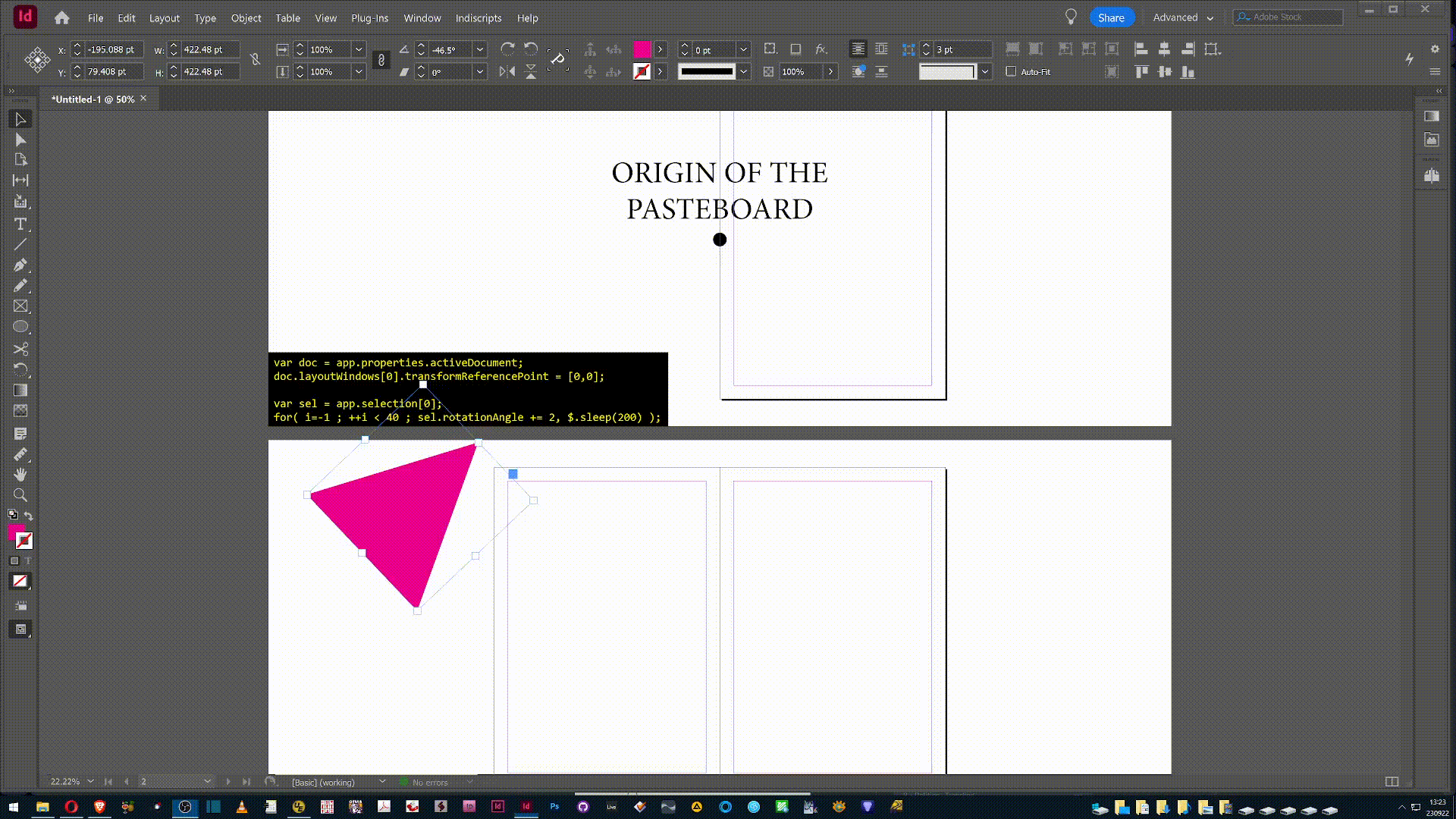 Doesn't matter what RulerOrigin I set, doesn't matter if I manually move (0,0) point in the InDesign - when I'm trying to rotate object via scripting - it's like (0,0) point is in the middle of the left edge of the first page???